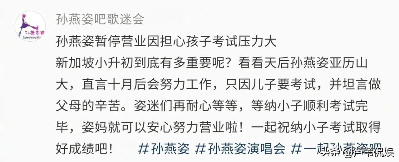 值得一提的是,孙燕姿本人还向大家承诺,十月以后自己会努力工作的,为什么要等到十月她给出了解释,那就是她家孩子要考试了。