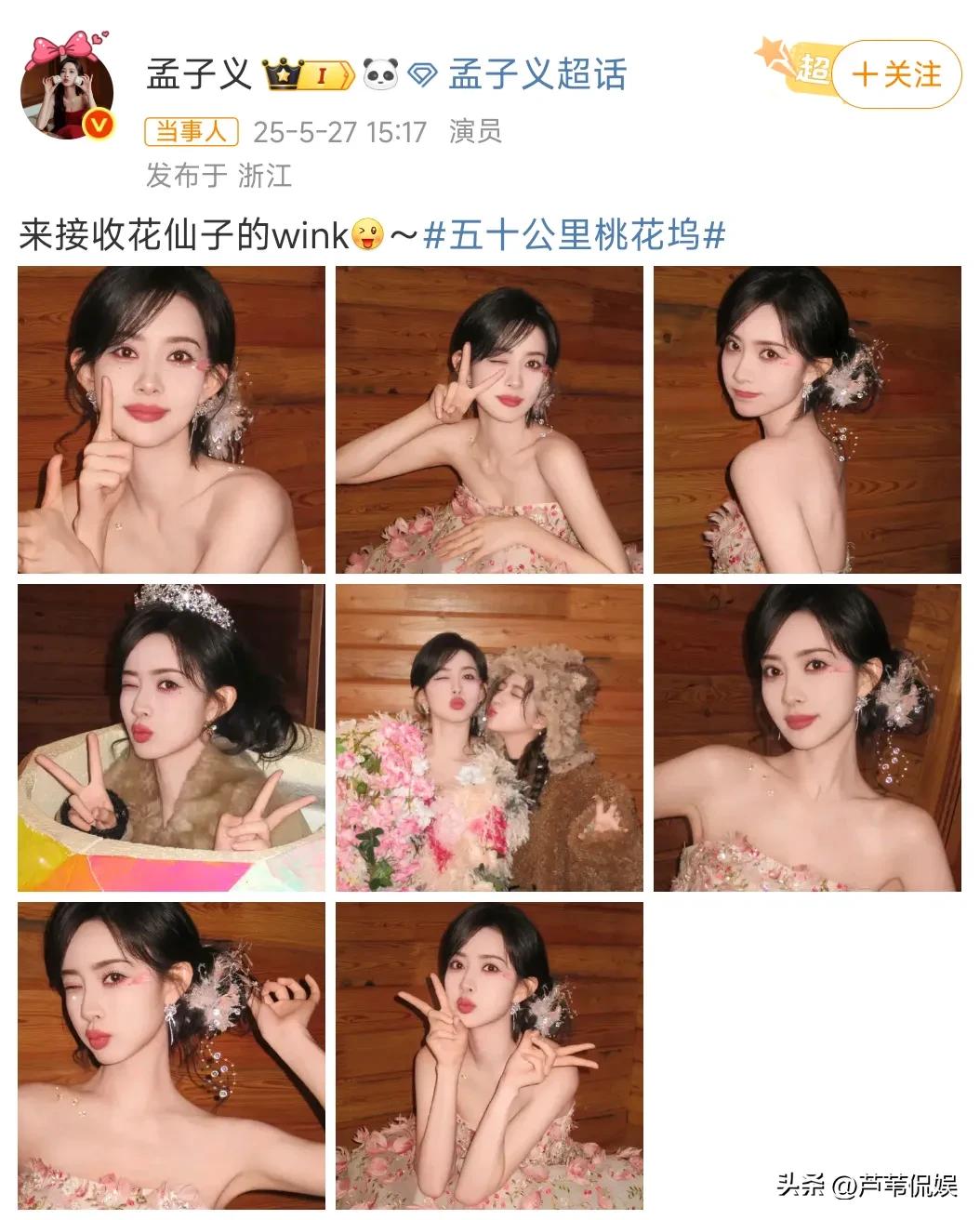 这还不算,孟子义还专门在社交平台上说“来接受花仙子的wink”,看得出来她对自己的妆造很满意。