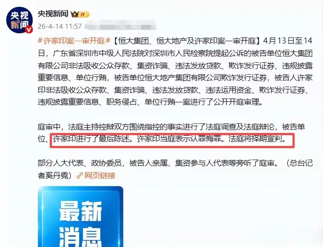 中国房地产行业曾经的风云人物许家印,最近在深圳法庭上站到了被告席。4月13日、14日这两天,深圳中院对他进行第一次公开审判。这位昔日大佬当庭认罪,还表示后悔。这场审判不仅让他个人命运悬于一线,更像一声警钟,敲响了中国房地产行业的转折点。