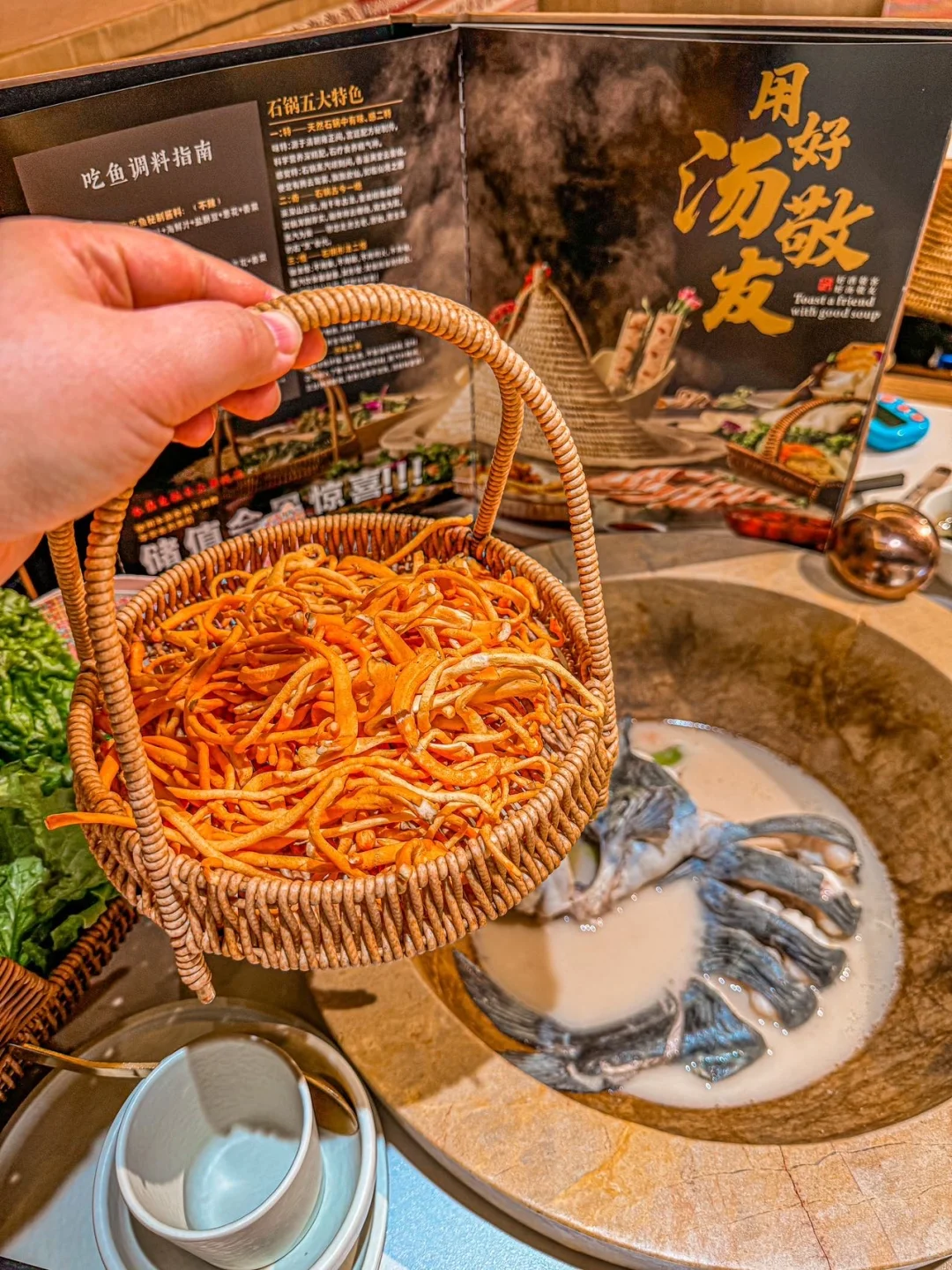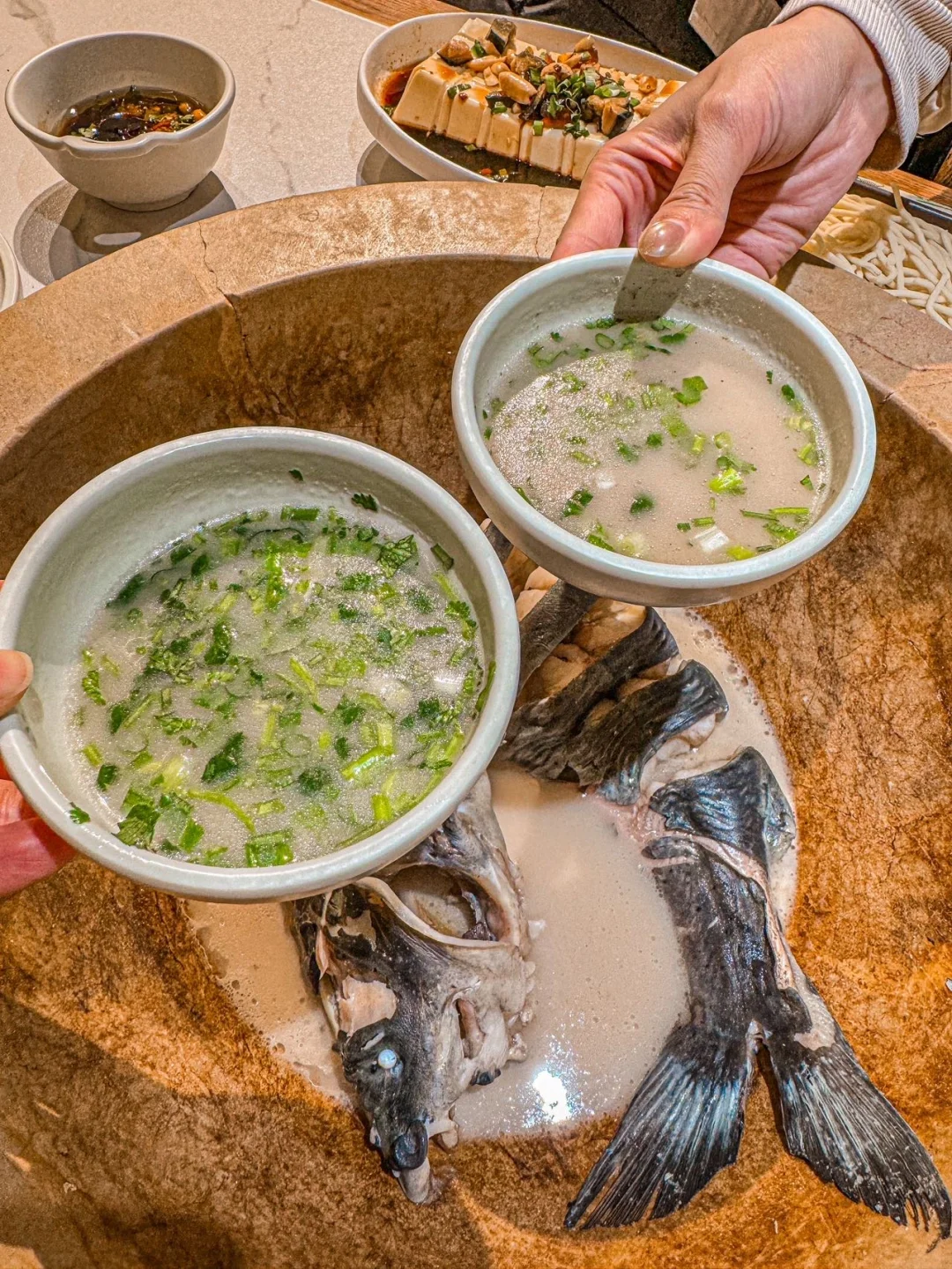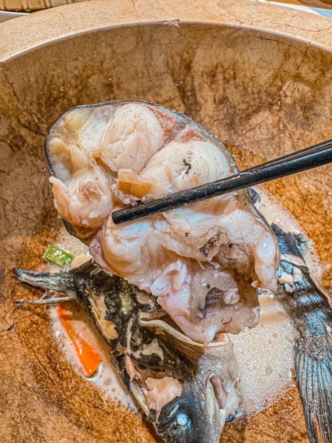 先喝汤再吃鱼肉 再把配菜倒锅里 蒸5分钟