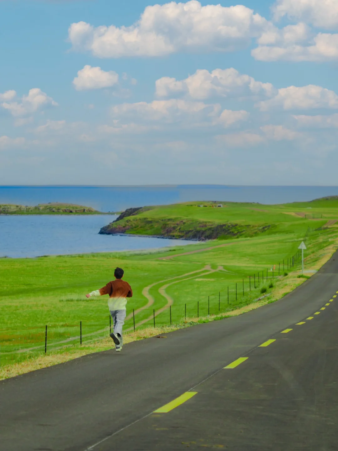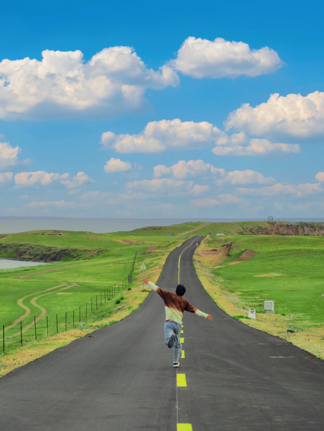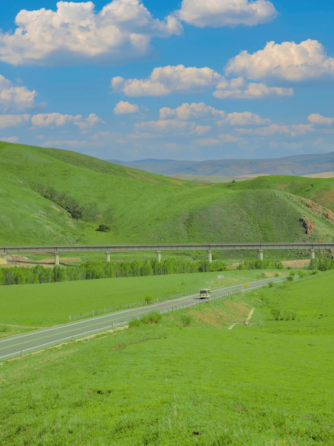 坐着车里,飞驰在草原天路上