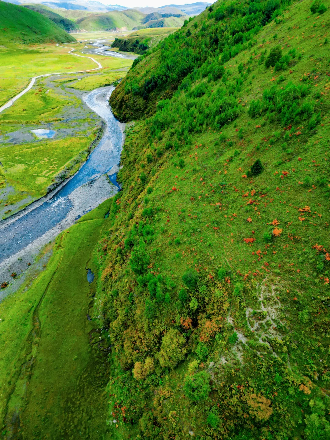 现在草甸都还是绿的,但山坡上已经有些许的秋色