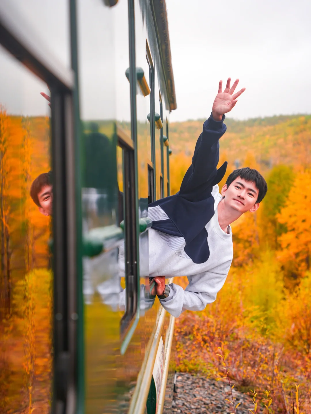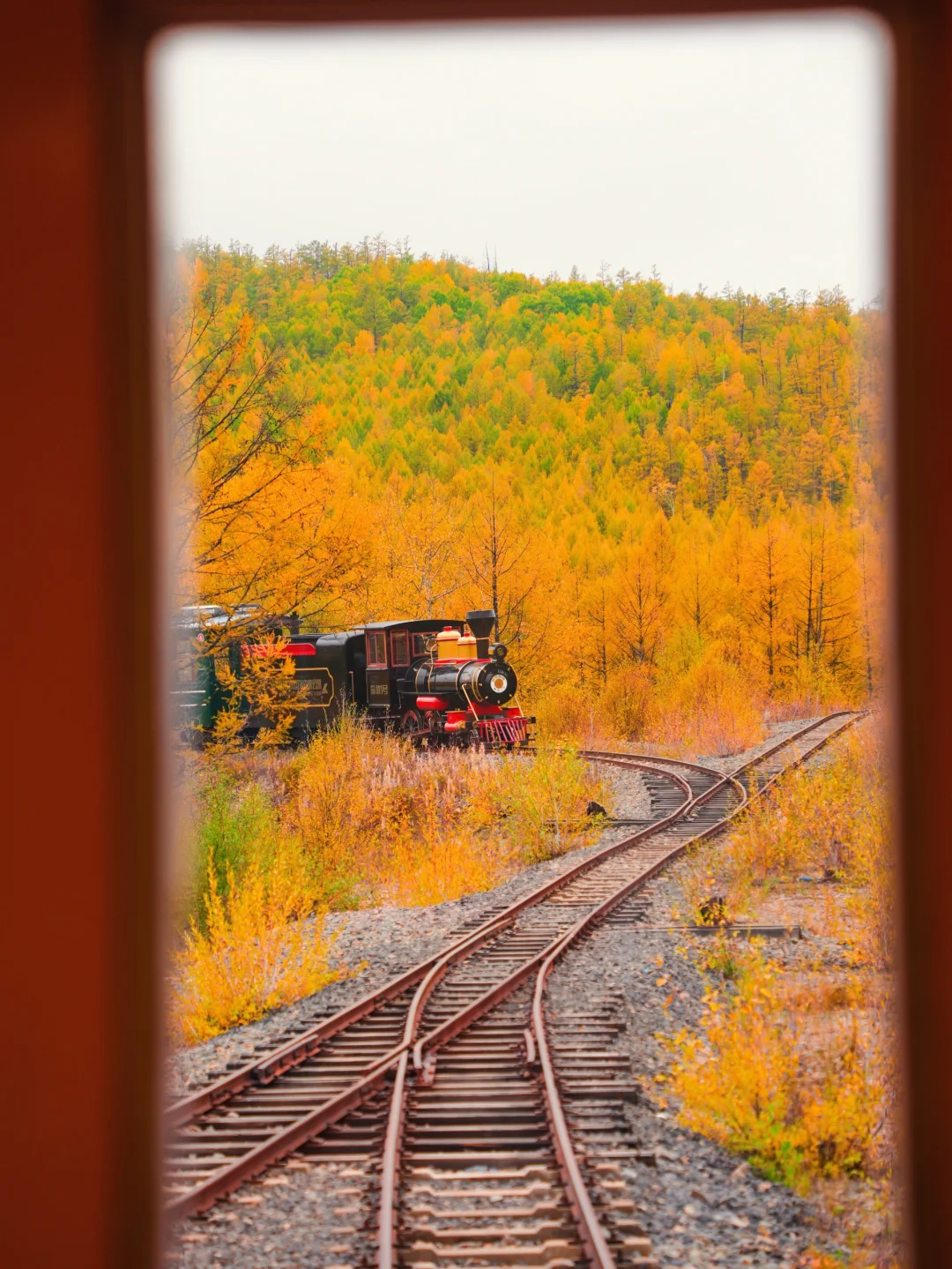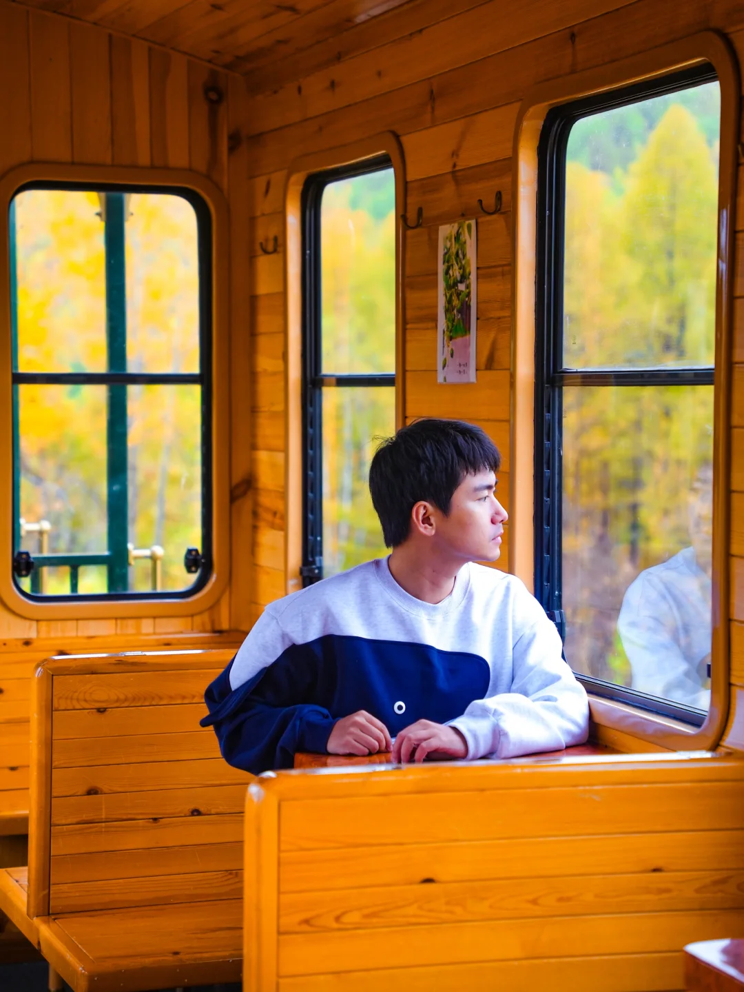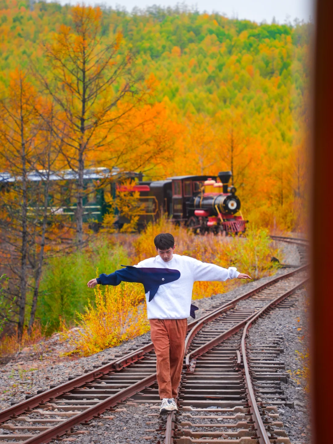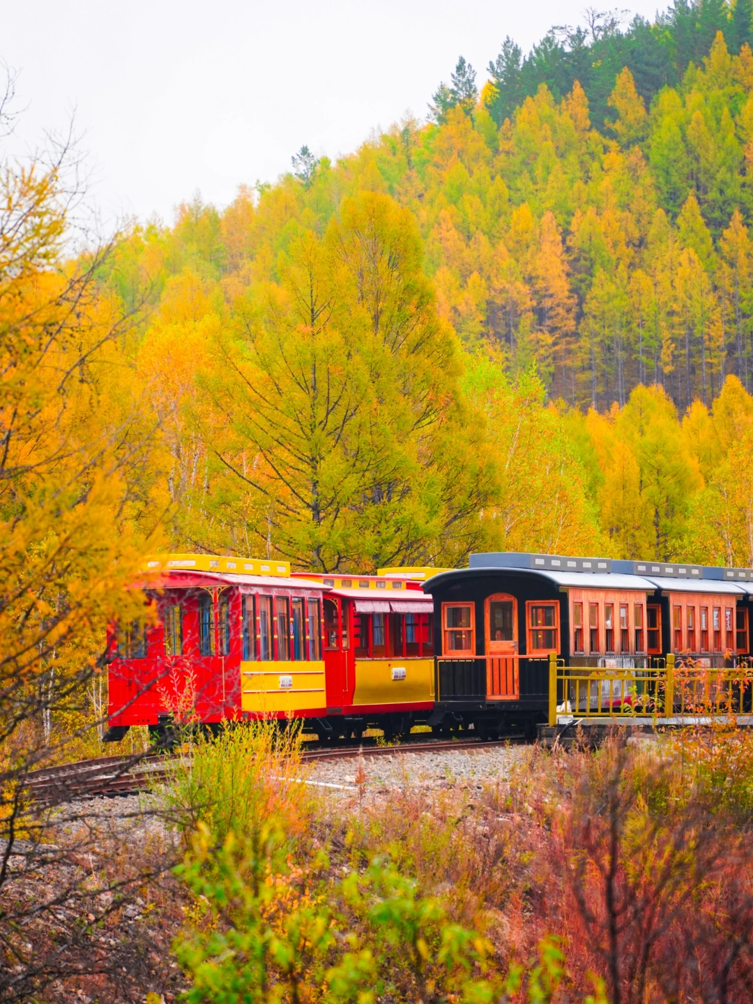 来这里之前最期待的就是这个童话般的森林小火车,红色,蓝色,绿色,原木色的小火车穿行在金黄色的森林间