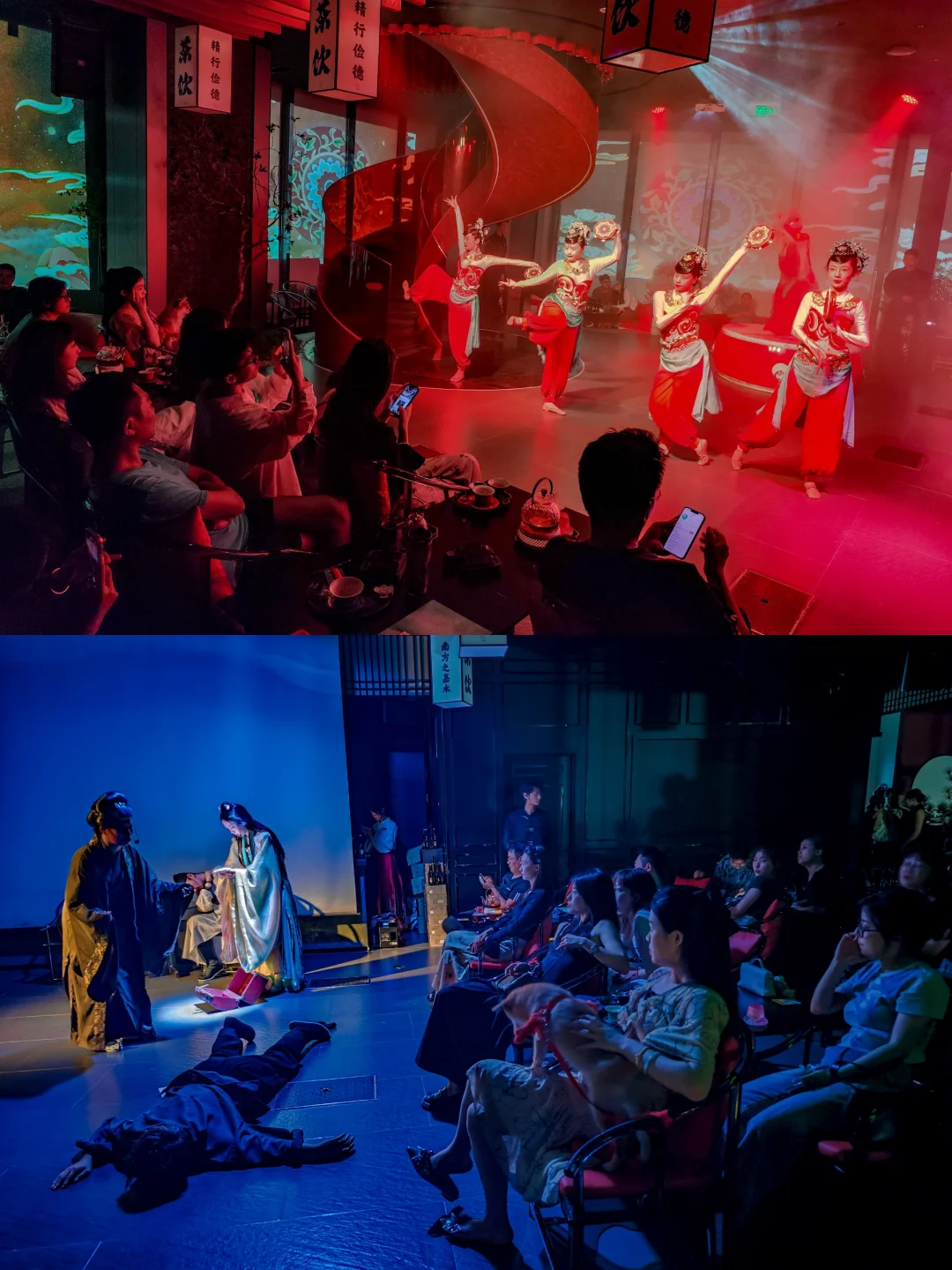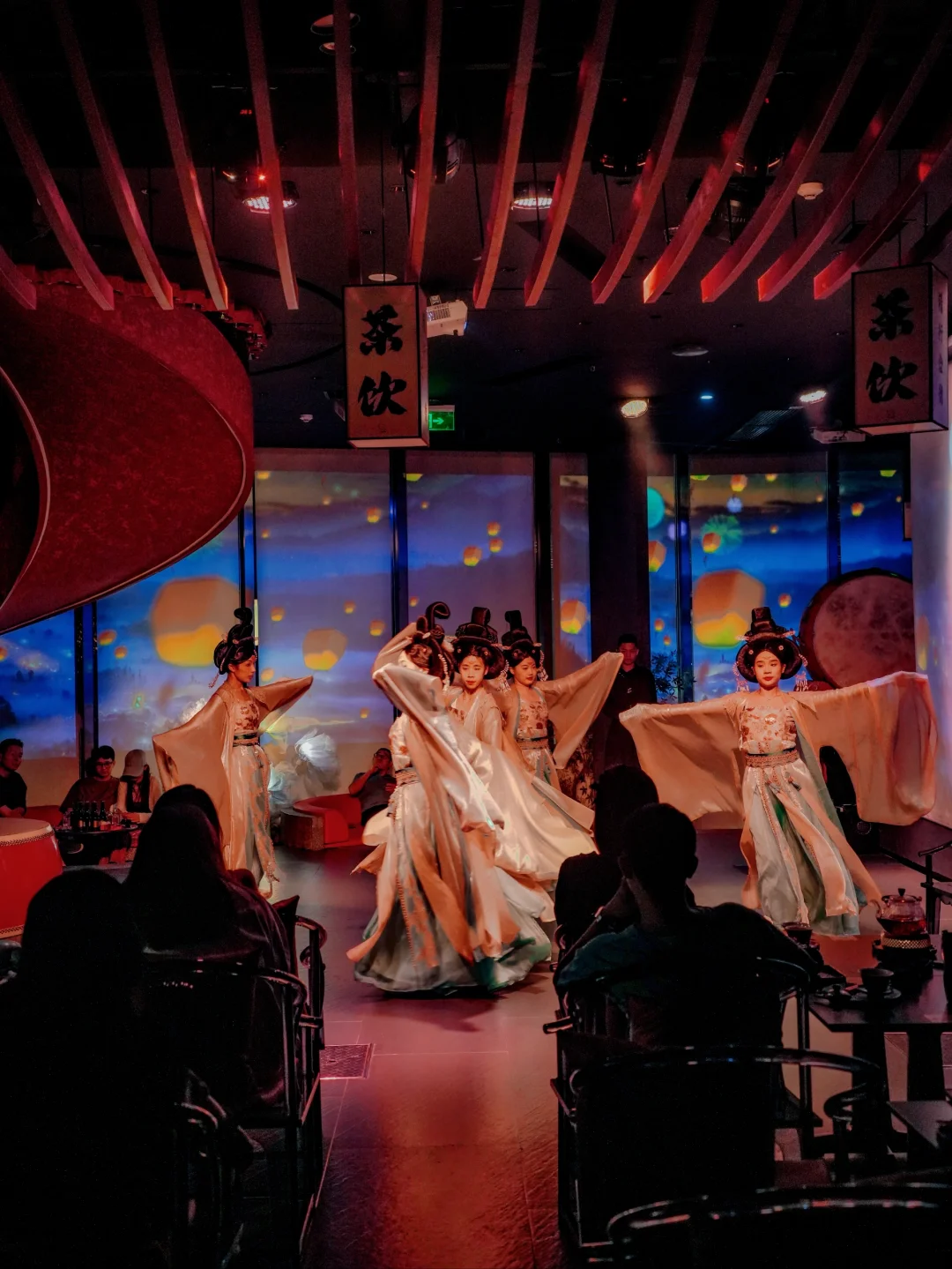 店里晚上的重头戏是实景故事演绎,真的阵仗太大了!而且不会对表演再单独收费! 表演的NPC都有十几个人,是完全可以去剧场表演的程度 中间穿插了羽衣霓裳舞 ,敦煌舞蹈,木兰舞,十分精彩!