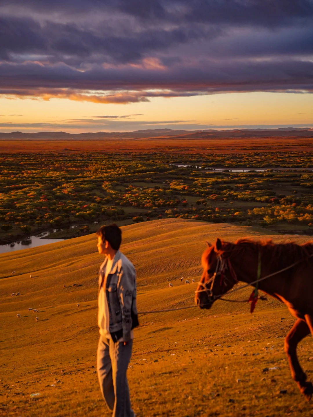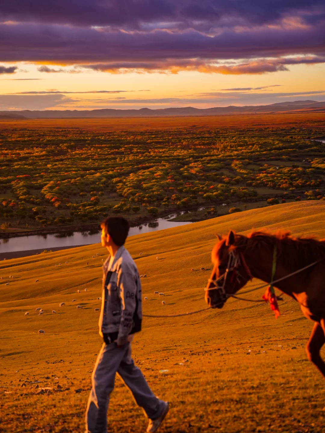 居高岭下看着漫山遍野的牛羊,五彩斑斓的彩林湿地,蜿蜒曲折的小河