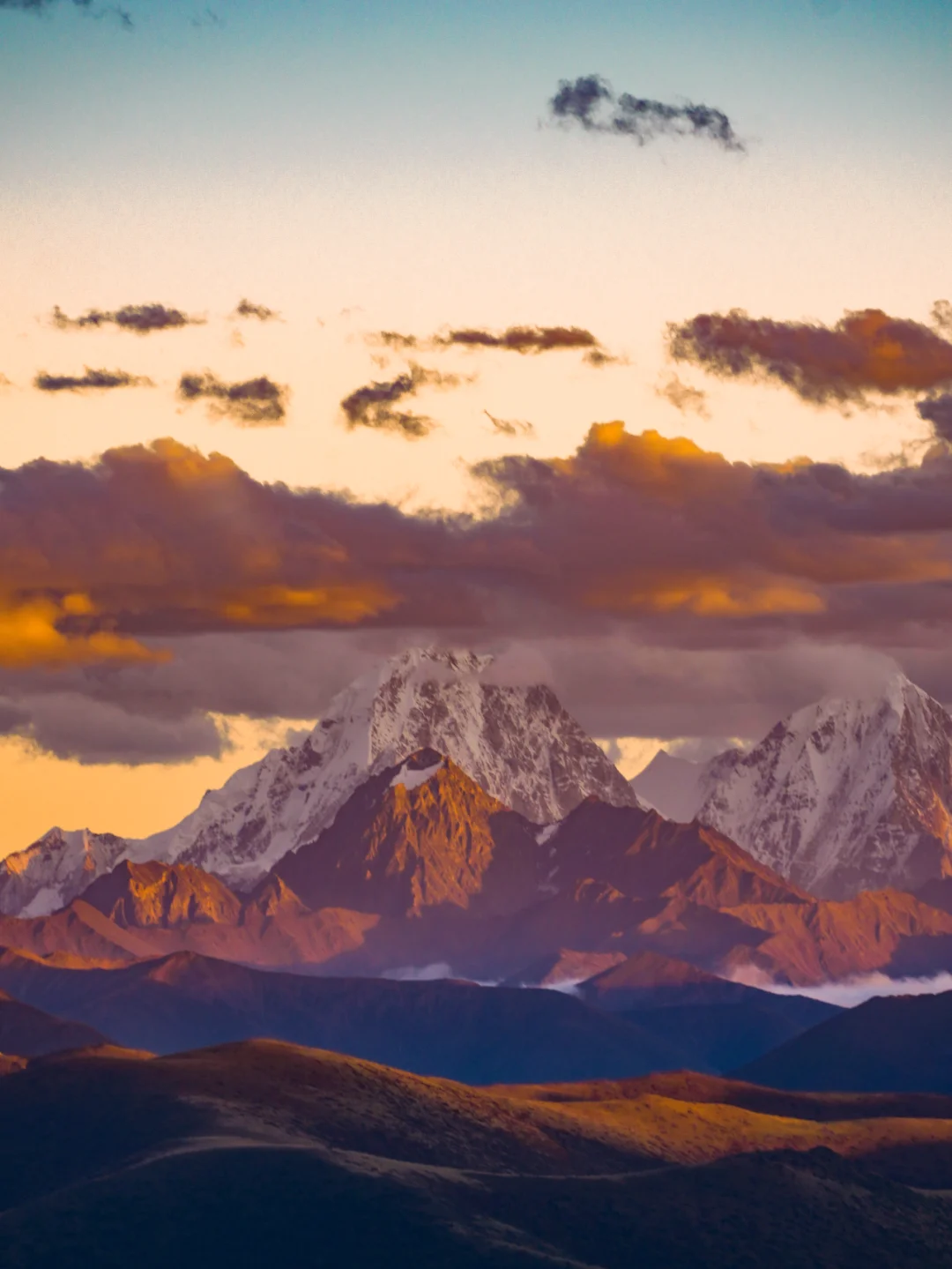 晚上7点左右,悬日逐渐落下,天空打碎蜜罐,日照金山开始