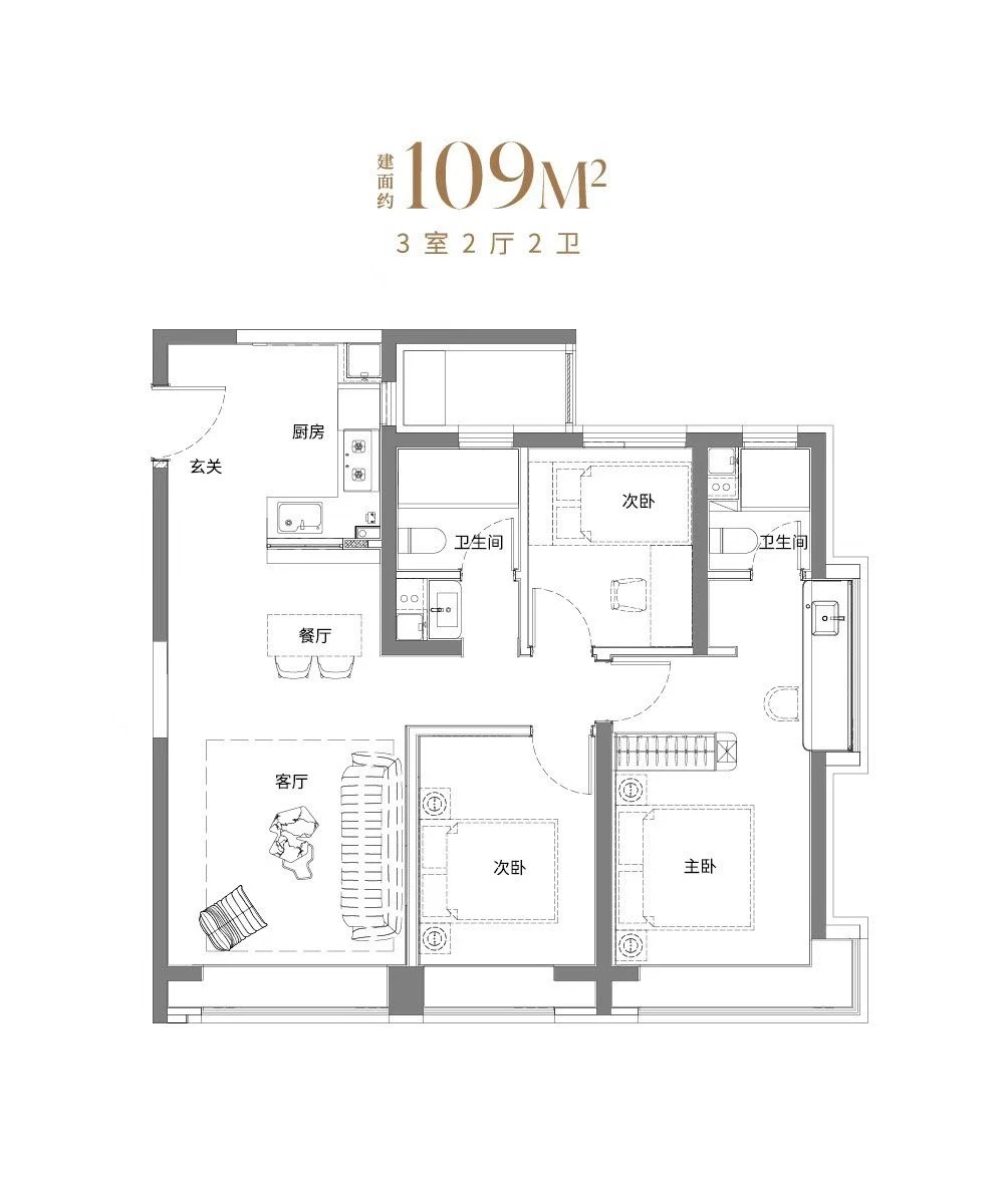 格调玖章109平米,全盘唯一一个三室两厅两卫,主流改善级别的户型,预计800个W