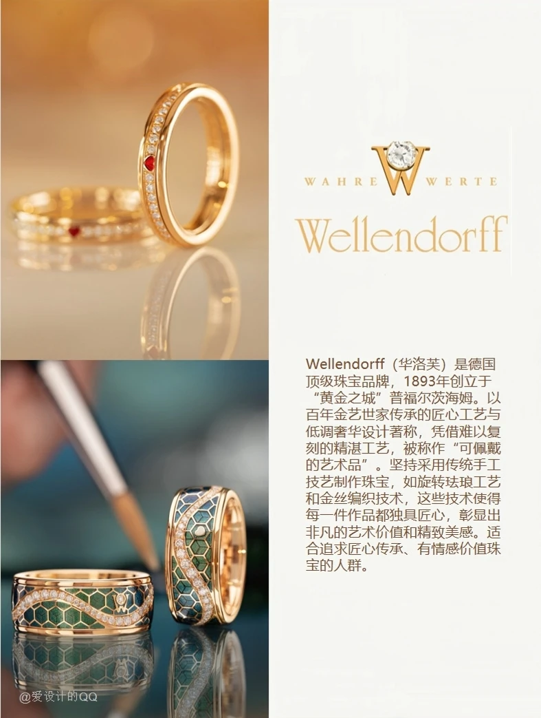 Wellendorff(华洛芙)是德国顶级珠宝品牌,1893年创立于“黄金之城”普福尔茨海姆。以百年金艺世家传承的匠心工艺与低调奢华设计著称,凭借难以复刻的精湛工艺,被称作“可佩戴的艺术品”。坚持传统手工技艺制作珠宝,如旋转珐琅工艺和金丝编织技术,这些技术使得每一件作品都独具匠心,彰显出非凡的艺术价值和精致美感。适合追求匠心传承、有情感价值珠宝的人群。