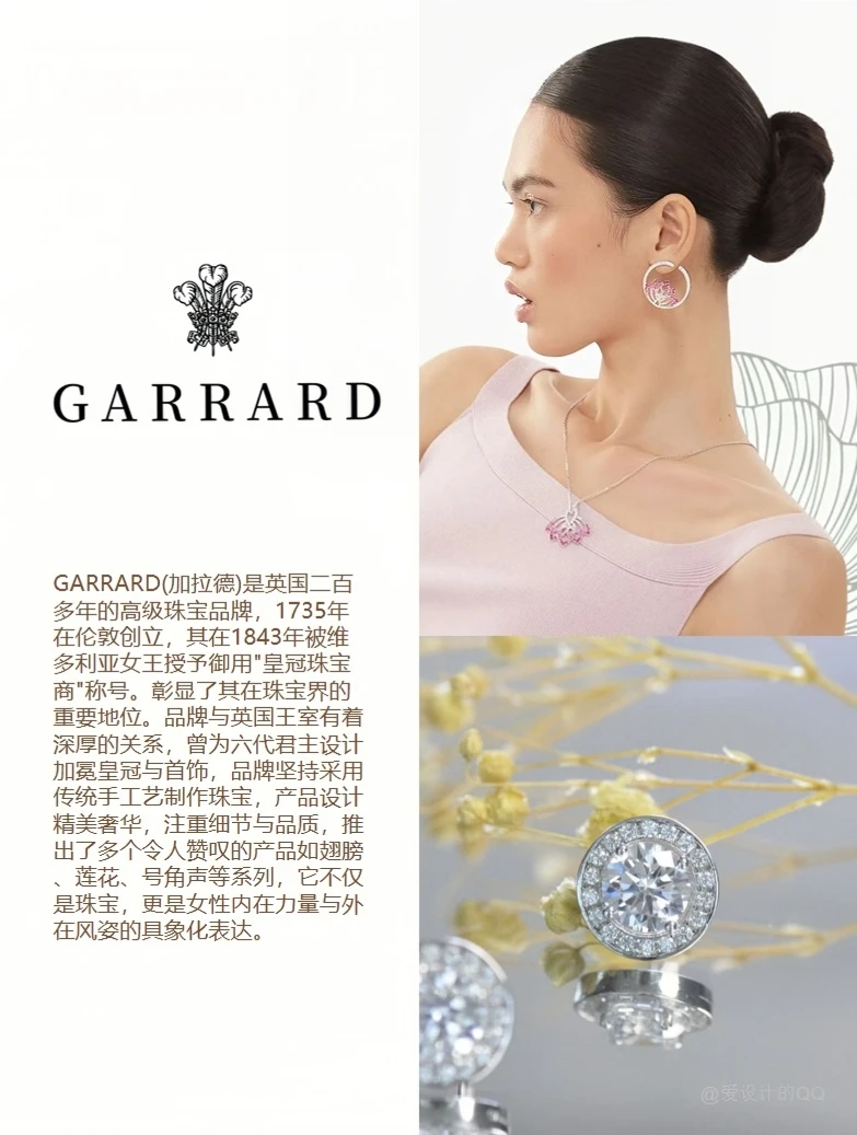 GARRARD (加拉德) 是英国二百多年的高级珠宝品牌,1735年在伦敦创立,其在1843年被维多利亚女王授予御用"皇冠珠宝商"称号。彰显了其在珠宝界的重要地位。品牌与英国王室有着深厚的关系,曾为六代君主设计加冕皇冠与首饰,品牌坚持传统手工艺制作珠宝,设计精美奢华,注重细节与品质,推出多个令人赞叹的产品如翅膀、莲花、号角声等系列。不仅是珠宝,更是女性内在力量与外在风姿的具象化表达。