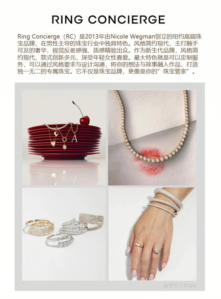 Ring Concierge(RC)是2013年由Nicole Wegman创立的纽约高端珠宝品牌,在男性主导的珠宝行业中独具特色。风格简约现代,主打触手可及的奢华,质感精致出众。作为新生代品牌,风格简约现代,款式创新多元,深受年轻女性喜爱。最大特色就是可以定制服务,可以通过风格要求与设计沟通,将你的想法与故事融入作品,打造独一无二的专属珠宝。它不仅是珠宝品牌,更像是你的”珠宝管家”。