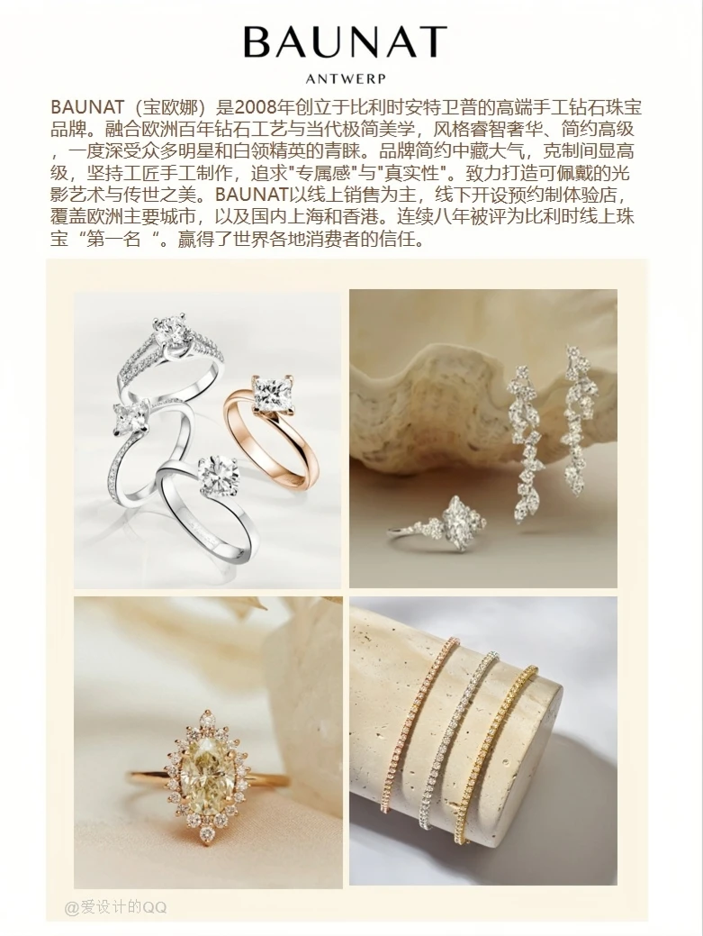 BAUNAT(宝欧娜)是2008年创立于比利时安特卫普的高端手工钻石珠宝品牌。融合欧洲百年钻石工艺与当代极简美学,风格睿智奢华、简约高级,一度深受众多明星和白领精英的青睐。品牌简约中藏大气,克制间显高级,坚持工匠手工制作,追求"专属感"与"真实性"。致力打造可佩戴的光影艺术与传世之美。以线上销售为主,线下开设预约制体验店,覆盖欧洲主要城市,以及国内上海和香港。连续八年被评为比利时线上珠宝“第一名“。赢得了世界各地消费者的信任。