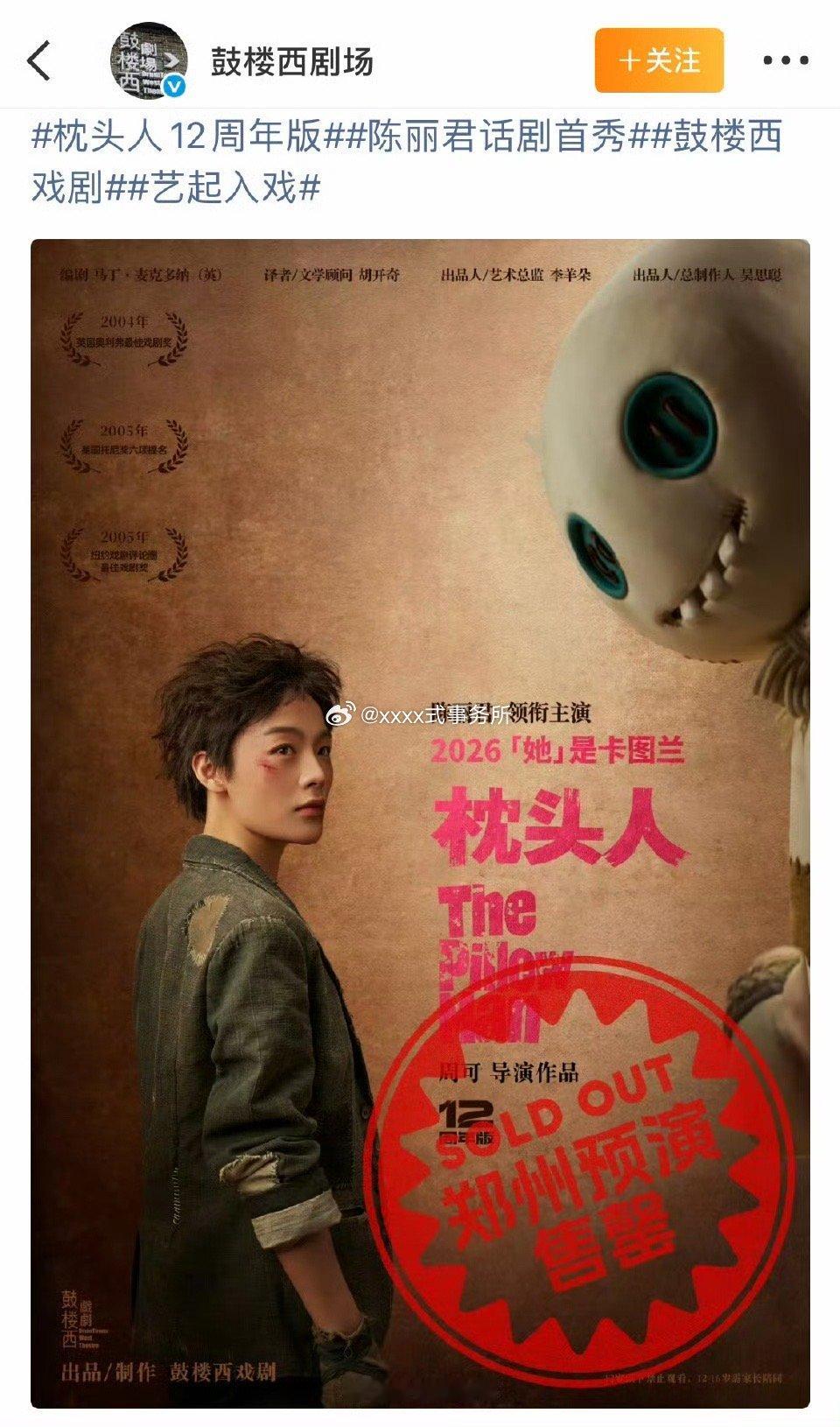 陈丽君领衔主演话剧《枕头人》几分钟郑州售罄;两场动员人次3372人、票房189万元这两天又在台湾连演《我的大观园》,在内地观众去不了的情况下依旧爆满,今天又售罄了两场话剧《枕头人》