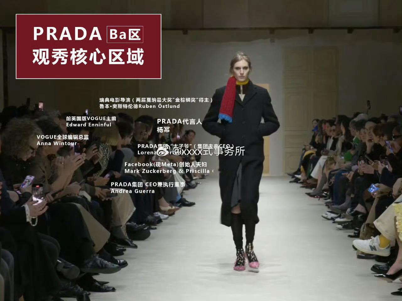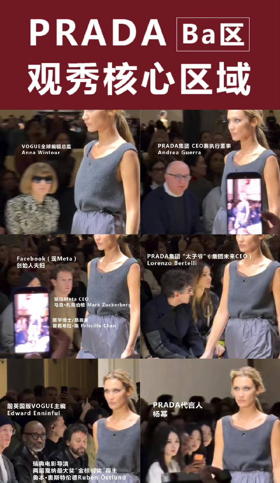 B区这一排有Prada集团的ceo和太子爷,Vogue全球编辑总监Anna Wintour,Facebook(现Meta)创始人夫妇,前英国版VOGUE主编Edward Enninful,两届戛纳导演,第一次看秀的代言人杨幂待遇真的夯爆了杨幂Prada秀场头排