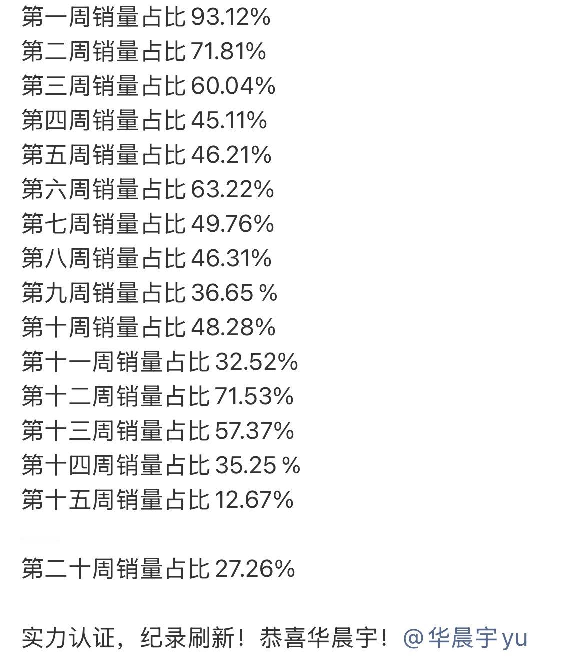 华晨宇第六张个人原创专辑《量变临界点》CD版持续在榜二十周,本周再次登顶五大周榜,拿下专辑第十六个五大周冠,周销量占比27.26%!!🎉