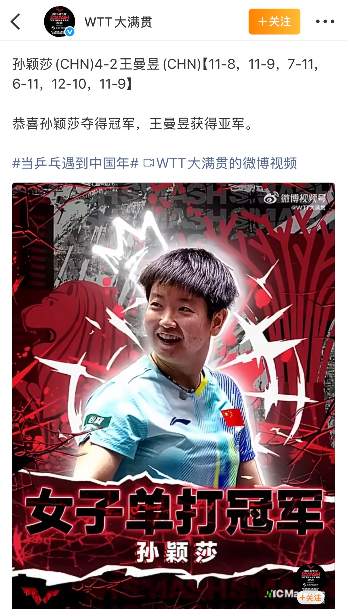 WTT大满贯赛事第一个五冠王诞生了,孙颖莎牛卫冕成功,2026开年两冠孙颖莎vs