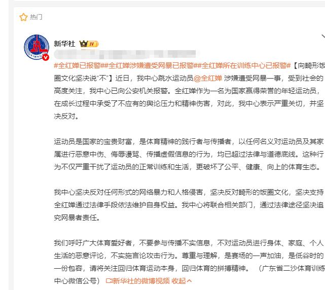 跳水运动员全红婵涉嫌遭受网暴一事 全红婵所在训练中心已向公安机关报警 新华社分享页