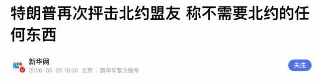 特朗普26日再次抨击北约盟友,称北约国家在美国对伊朗军事行动中“绝对没有提供任何帮助”。“美国不再需要北约的任何东西”。
