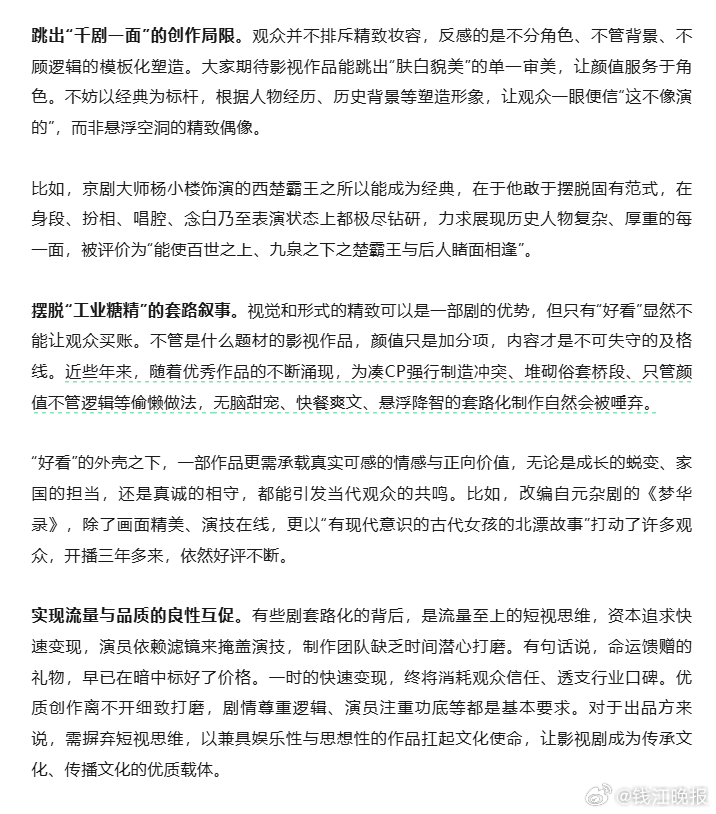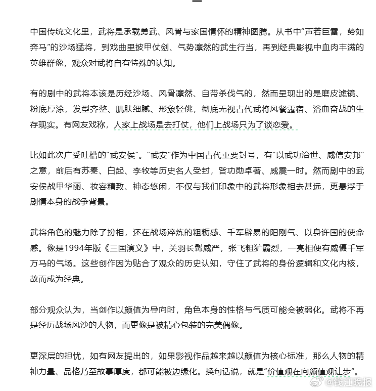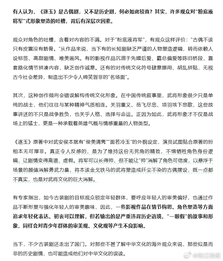【#浙江宣传评粉底液将军#】#粉底液将军为何激起群嘲# 最近,因热播剧《逐玉》男主角武安侯披甲归来,面容俊秀、妆容精致,毫无杀伐气,被很多网友称作“六点打仗,四点起来化妆”的“粉底液将军”。这意外带火了演员何润东饰演的项羽,其勇猛霸气、凶悍粗粝的形象与《逐玉》中肤白貌美的武安侯形成了鲜明反差。相关讨论更从演员形象,逐渐深入到当下影视剧内容、审美等诸多方面。近年来,国产好剧迭出。《逐玉》开播以来就备受关注,收获不少好评。但是,“粉底液将军”为何会激起群嘲?今天,我们不妨聊聊这个话题↓#逐玉谢征吸长玉锁骨#