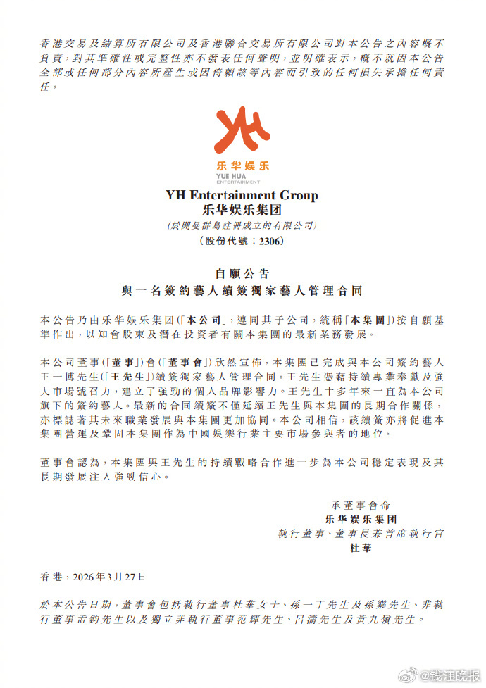 【#王一博乐华续约#】 3月27日,乐华娱乐发布公告,宣布与王一博已完成续签艺人
