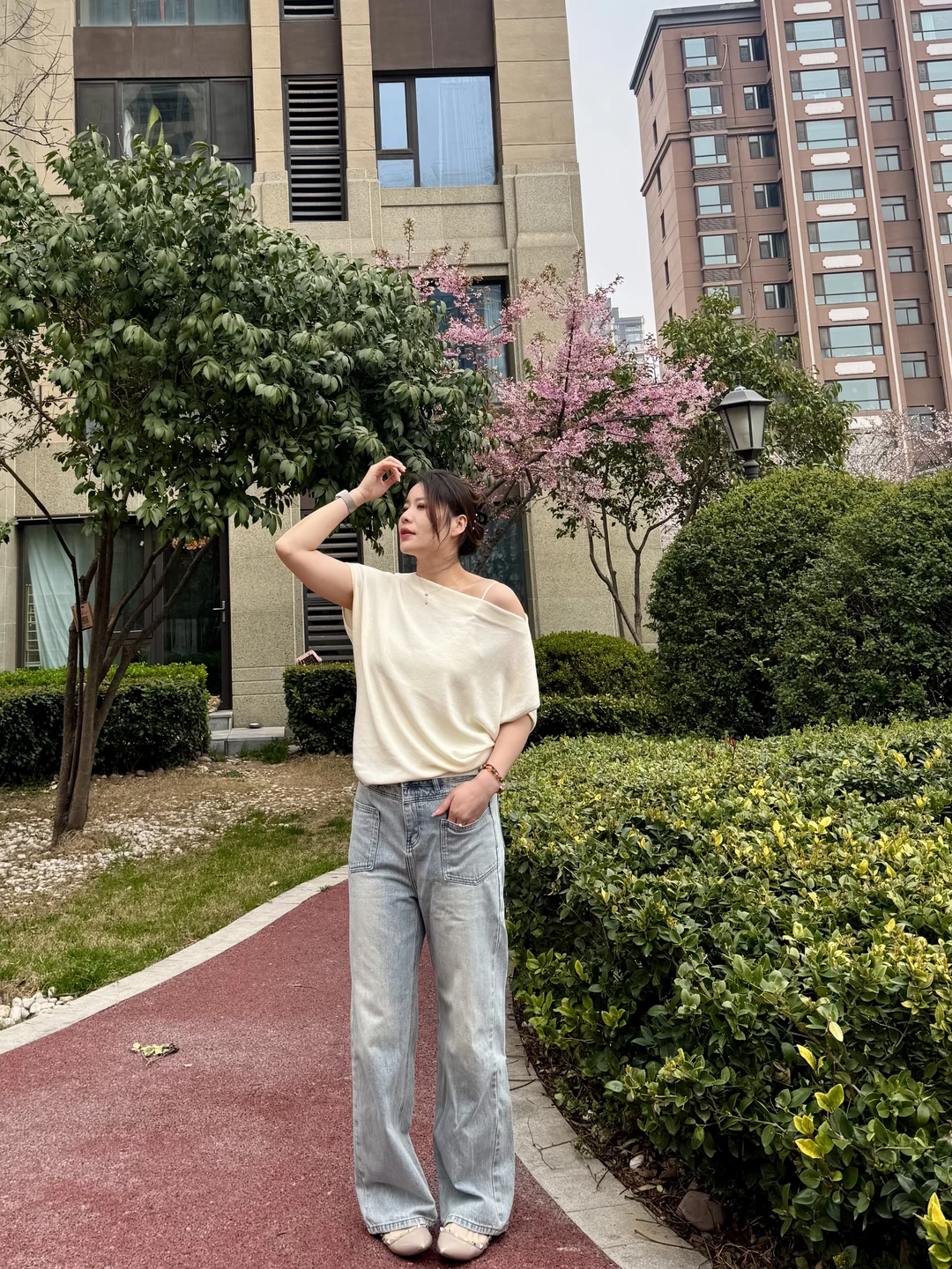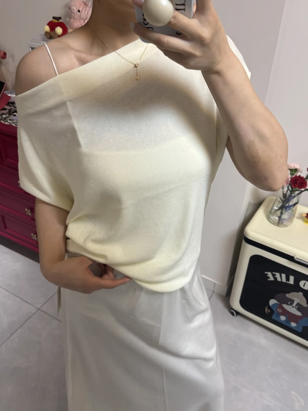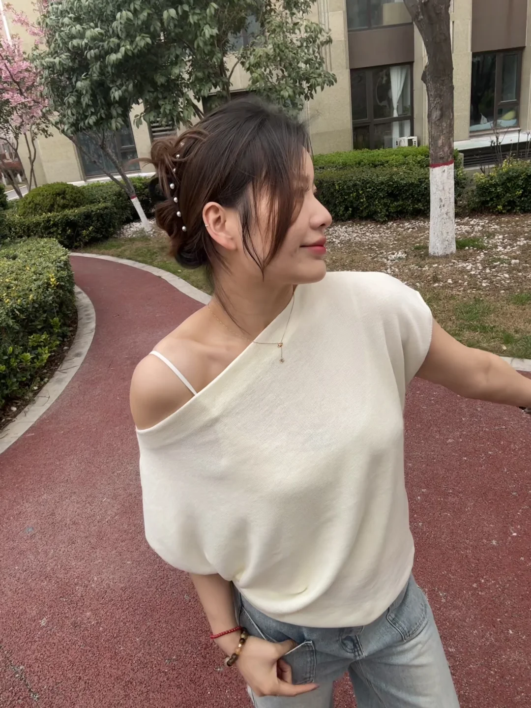 落肩蝙蝠袖+斜肩剪裁完美修饰肩线和手臂