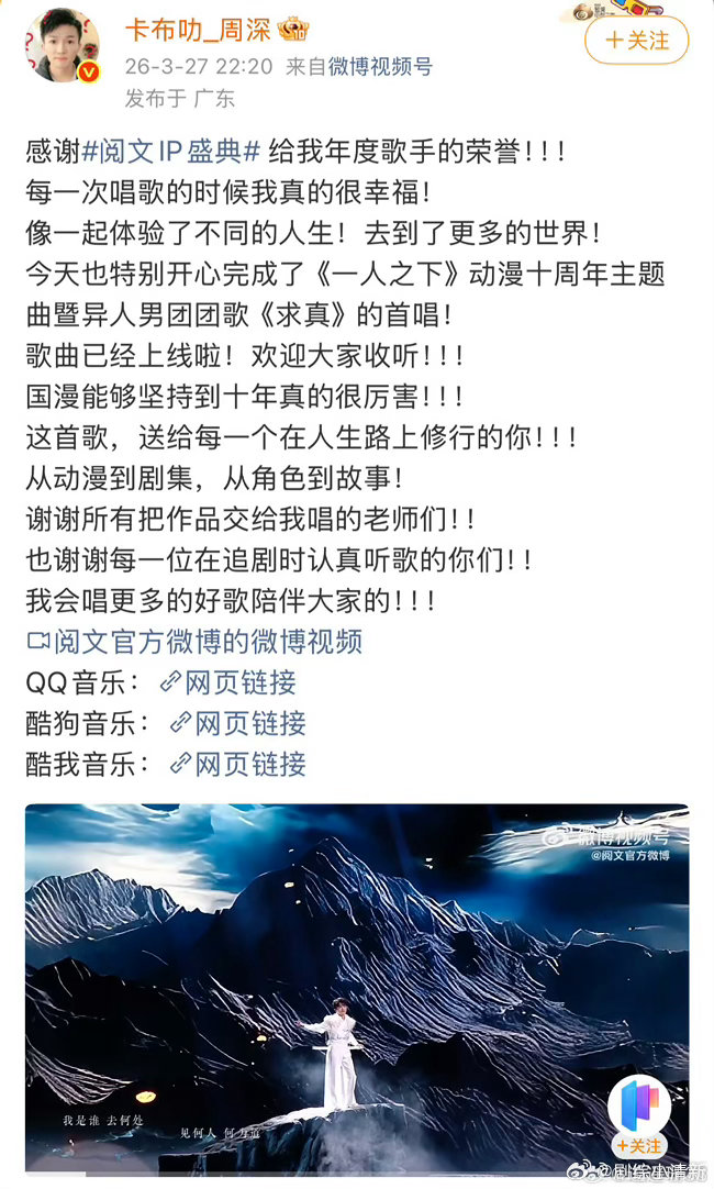 周深内娱ost豪门周深新歌从夯到夯 周深给《一人之下》唱了两首,现在又发了《求真》。这ost豪门的名号,确实不是白来的。今晚盛典首唱,蹲一个。