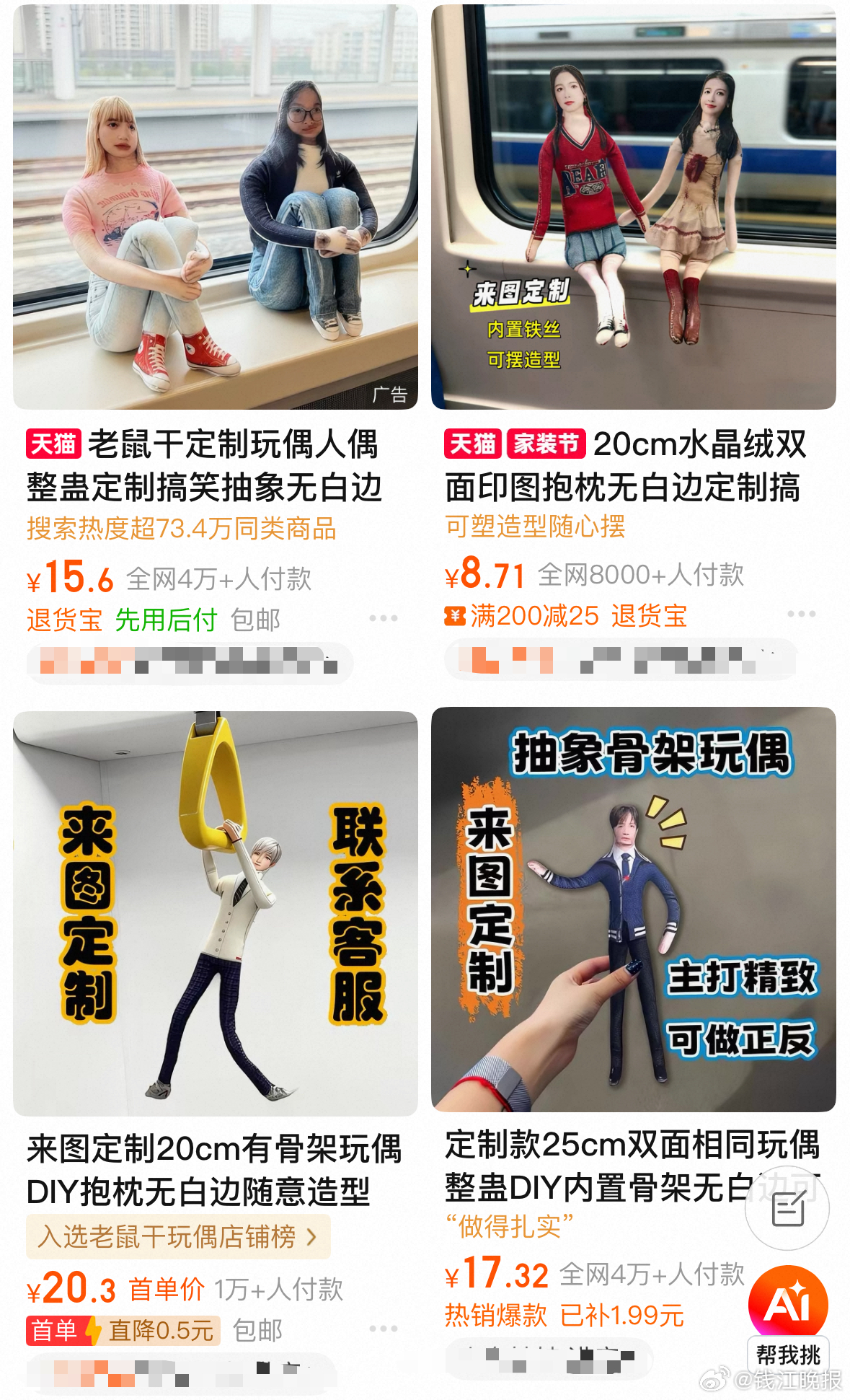 潮新闻记者从电商平台了解到,这类“老鼠干”价格十分亲民,尺寸多在15至30厘米之间,定制价格从几块到十几元不等,支持将动漫角色、同学照片等定制成专属玩偶。
