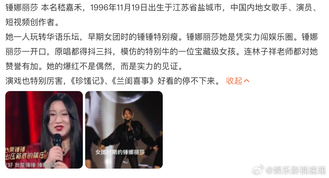 锤娜丽莎本名叫嵇嘉禾锤娜丽莎原名嵇嘉禾 谁懂啊锤娜丽莎的原名居然这么好听,嵇嘉禾三个字听着就很有质感,和她综艺里的搞笑形象反差太大了,但这就是真实的她啊。