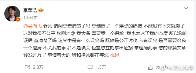 歌手李荣浩发文回应:并未在个人演唱会或音乐节或晚会中唱过这首歌曲,请列明场次,若最终责任人主体是我,我一定公开赔偿道歉 ,并承认错误,再严重的后果我自愿承担,绝不推辞。随后,李荣浩再次发文回应:老师,请问您查清楚了吗?您制造了一个爆点的热搜,不能没有下文就撤了,这对我很不公平。您刚才@ 我大名,需要我一个道歉,我也表达了我的态度,所以您的证据查清楚了吗?这其中是有什么误会吗?既然是公开讨伐,若有误会,是否需要给我一个澄清,不关我的事,若不是误会,也望您立刻拿出证据,来理清此事。您的那篇文章转发过万了,事情蛮大的,我和律师都在等您。