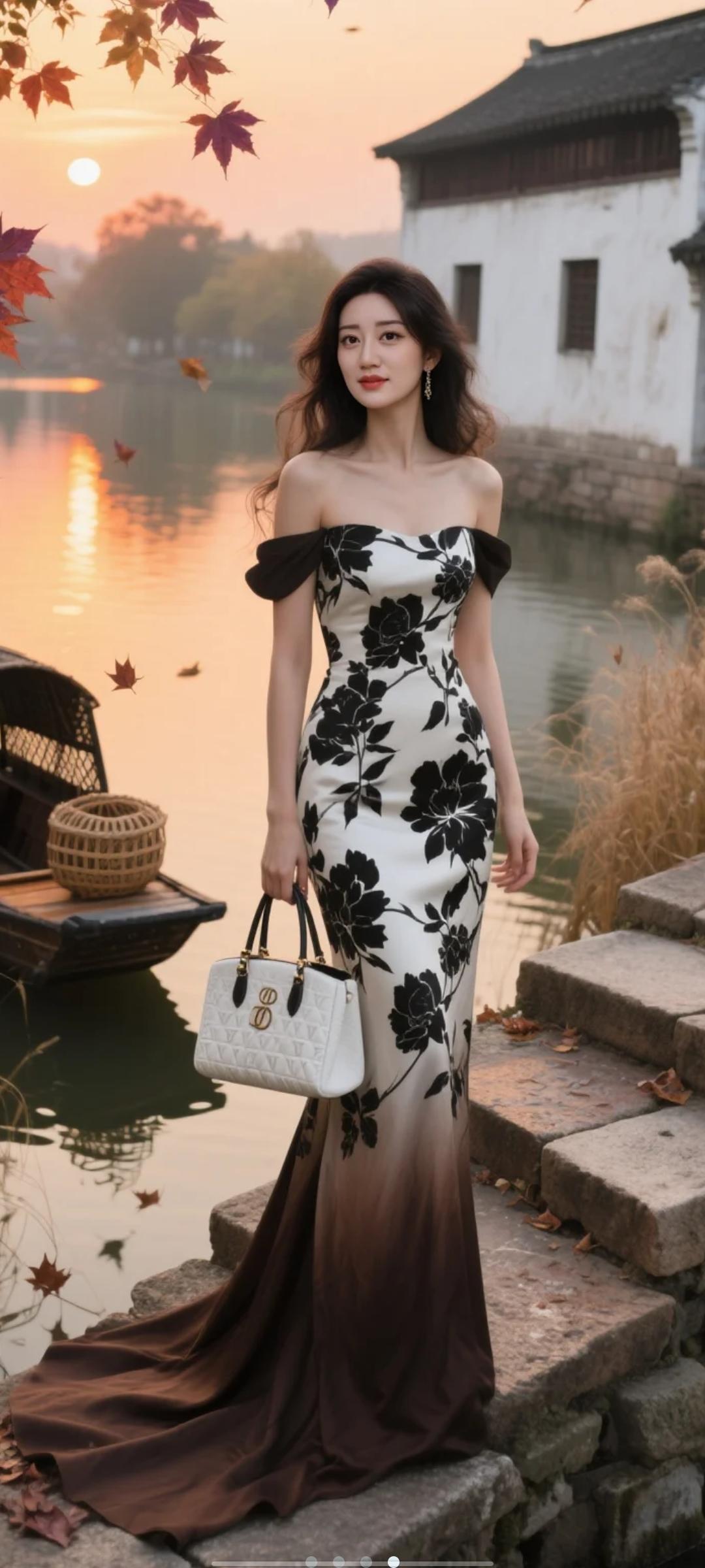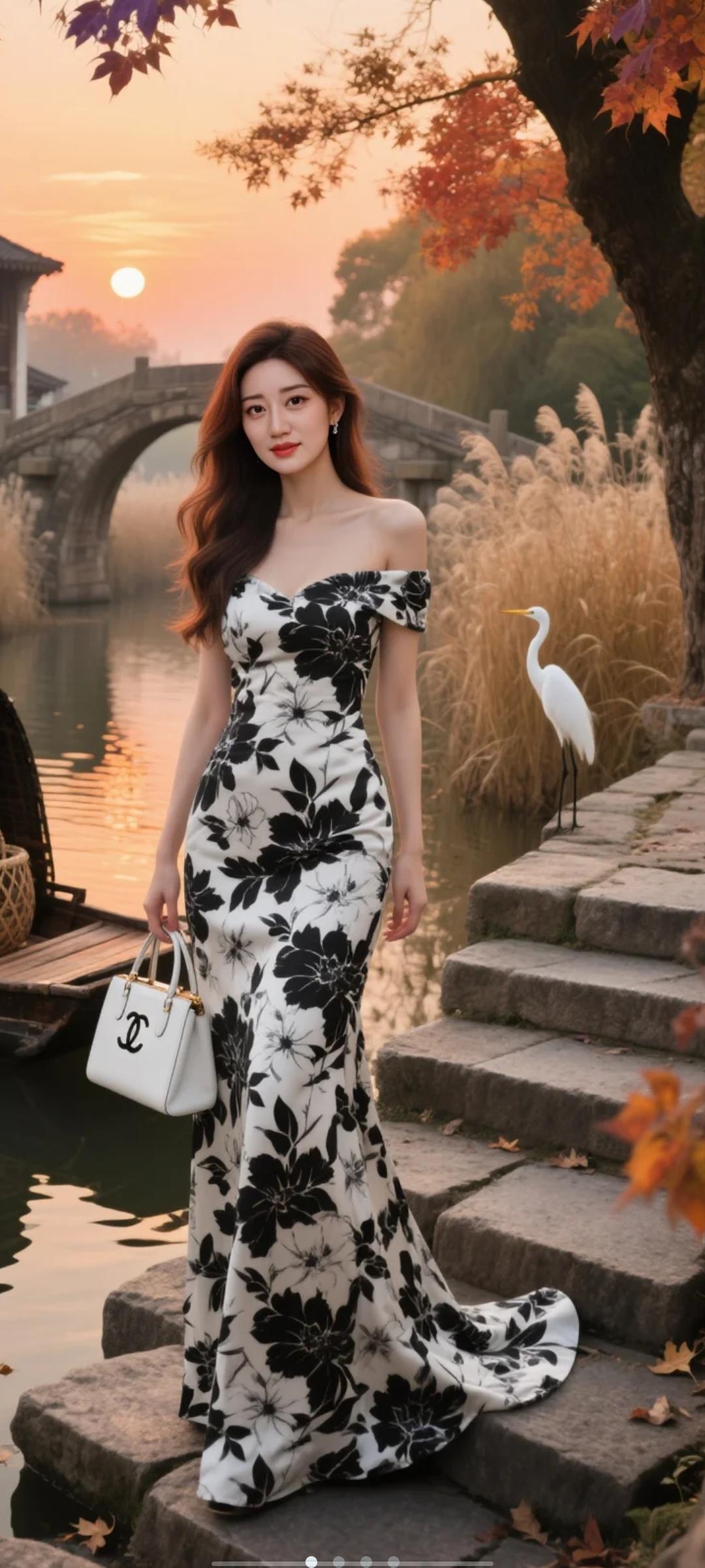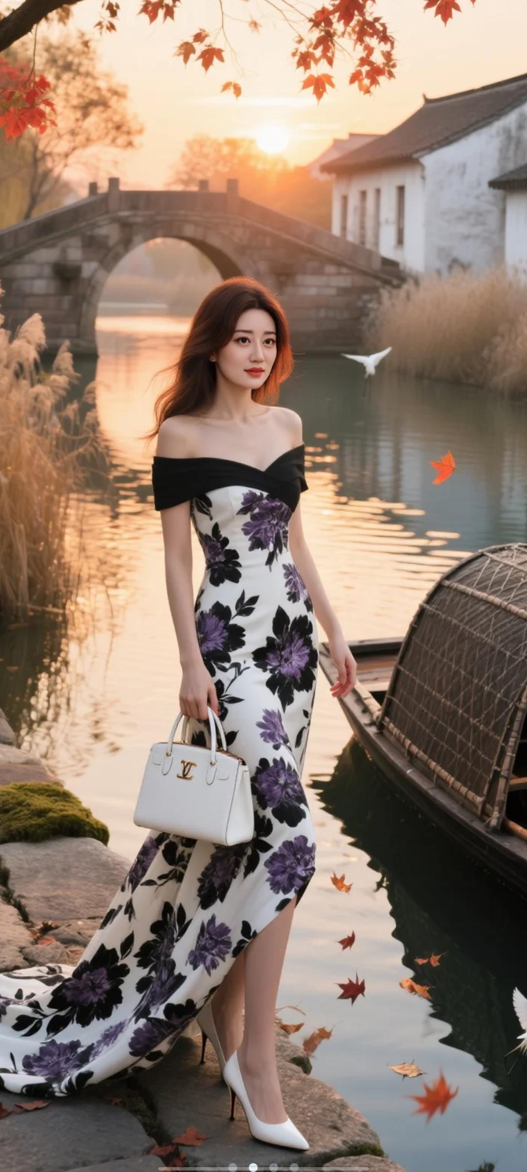 秋日河畔,红衣美人,花裙飘逸,白包相伴,唯美如画。