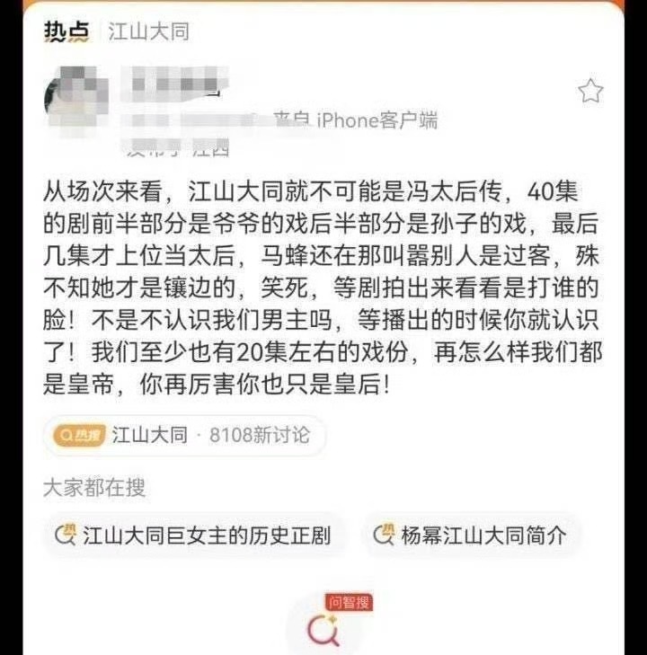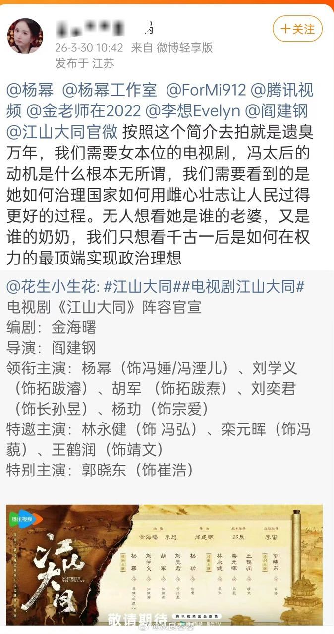 《江山大同》原来有历史人物原型的大女主传记,简介变成了感情线为主的群像剧。 杨幂工作室正在挨麻辣也是应该的