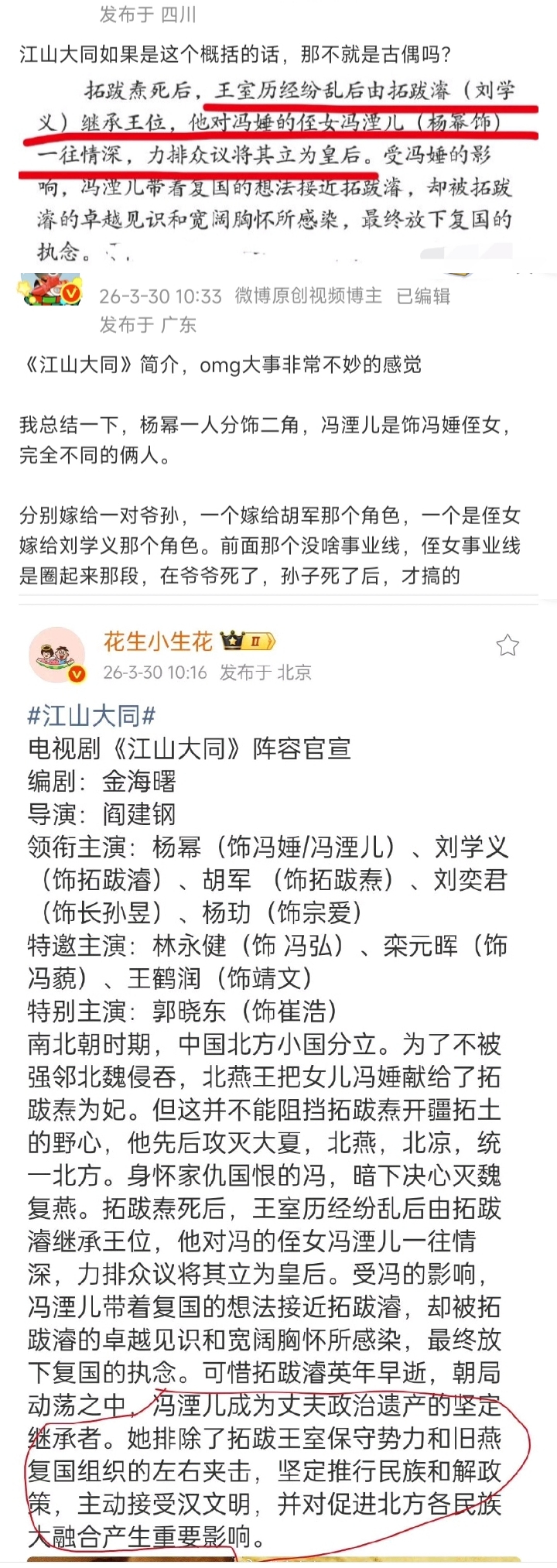 《江山大同》原来有历史人物原型的大女主传记,简介变成了感情线为主的群像剧。 杨幂