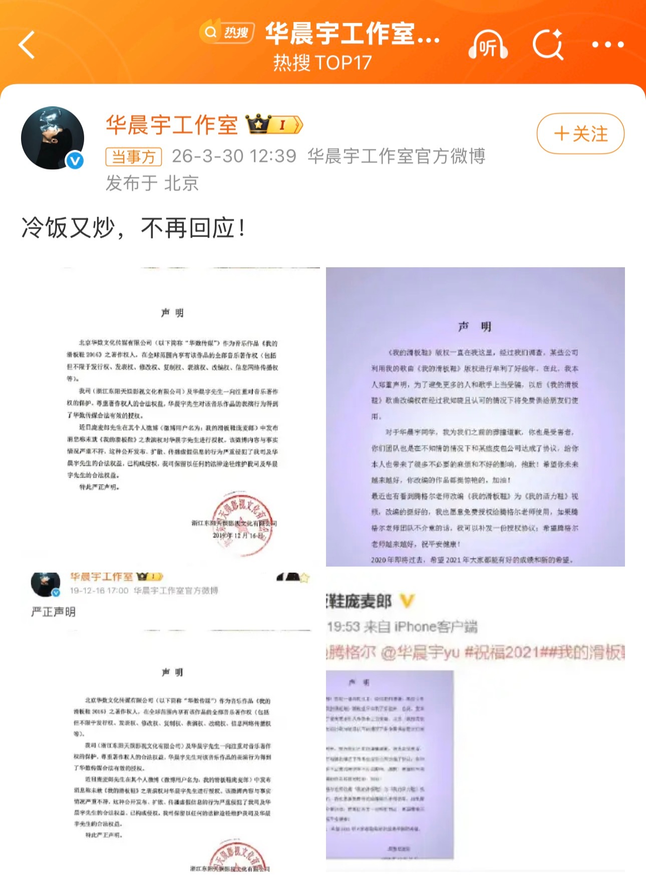 华晨宇工作室发完“冷饭又炒”后,庞麦郎又转发了李荣浩的微博。
