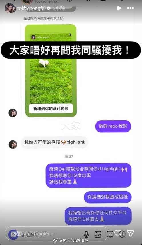 不过,Rocky公开照片不到24小时,唐菲便在IG限时动态公开与Rocky的对话截图,激动要求对方:“麻烦删掉我们所有合照和你的精选内容,我不想出现在你的IG里,请给我尊重。你这样对我造成困扰。我不想出现在你任何社交平台,麻烦全部删掉。”
