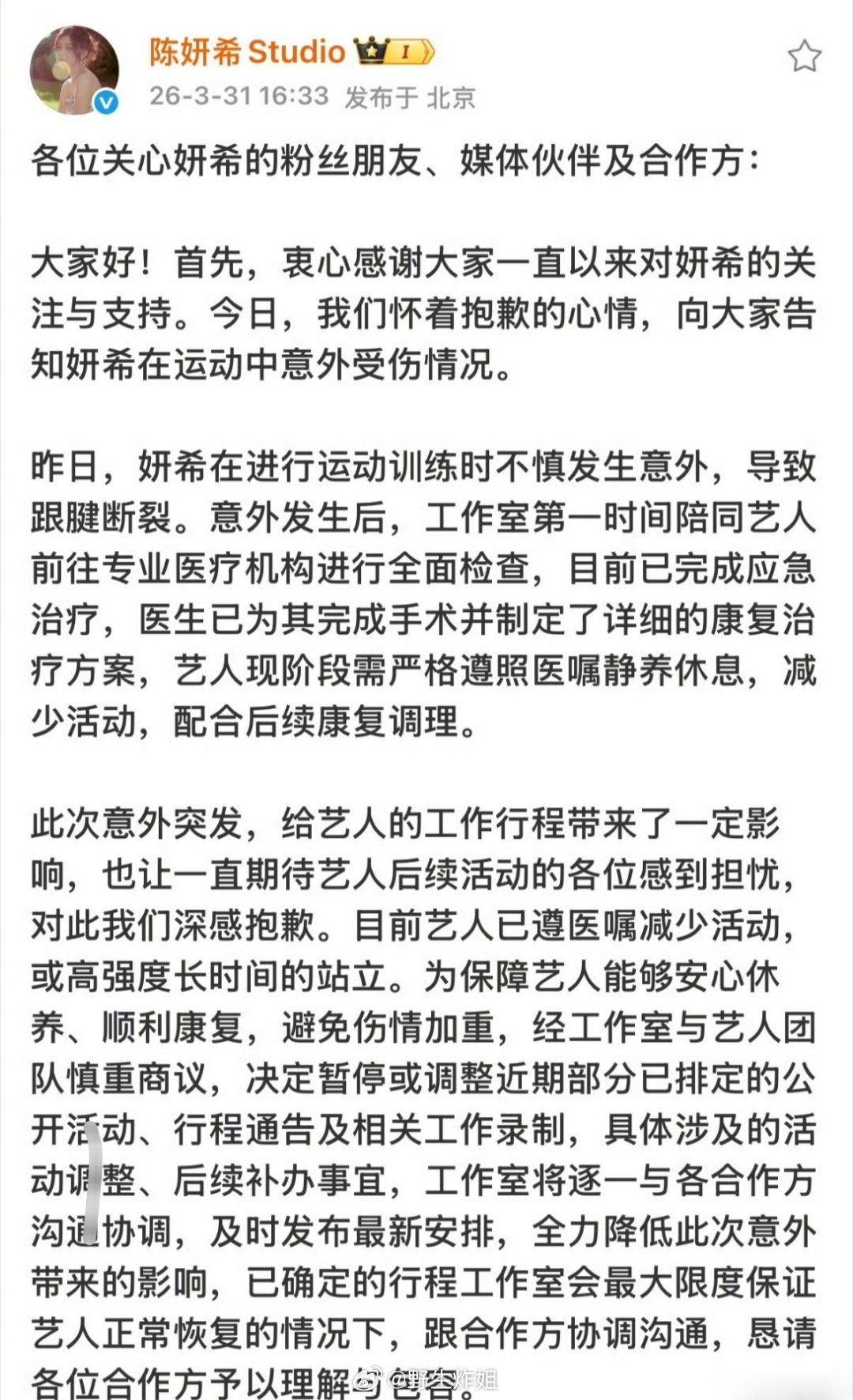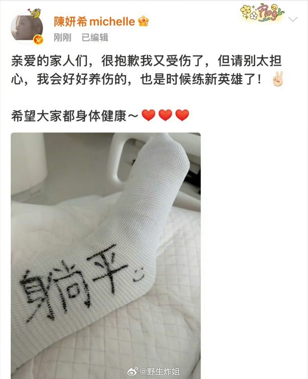 我的天啊,陈妍希在运动的时候,不小心给自己给整成跟腱断裂了,这也是直接喜提石膏了 ,心态还挺好,还给画了笑脸