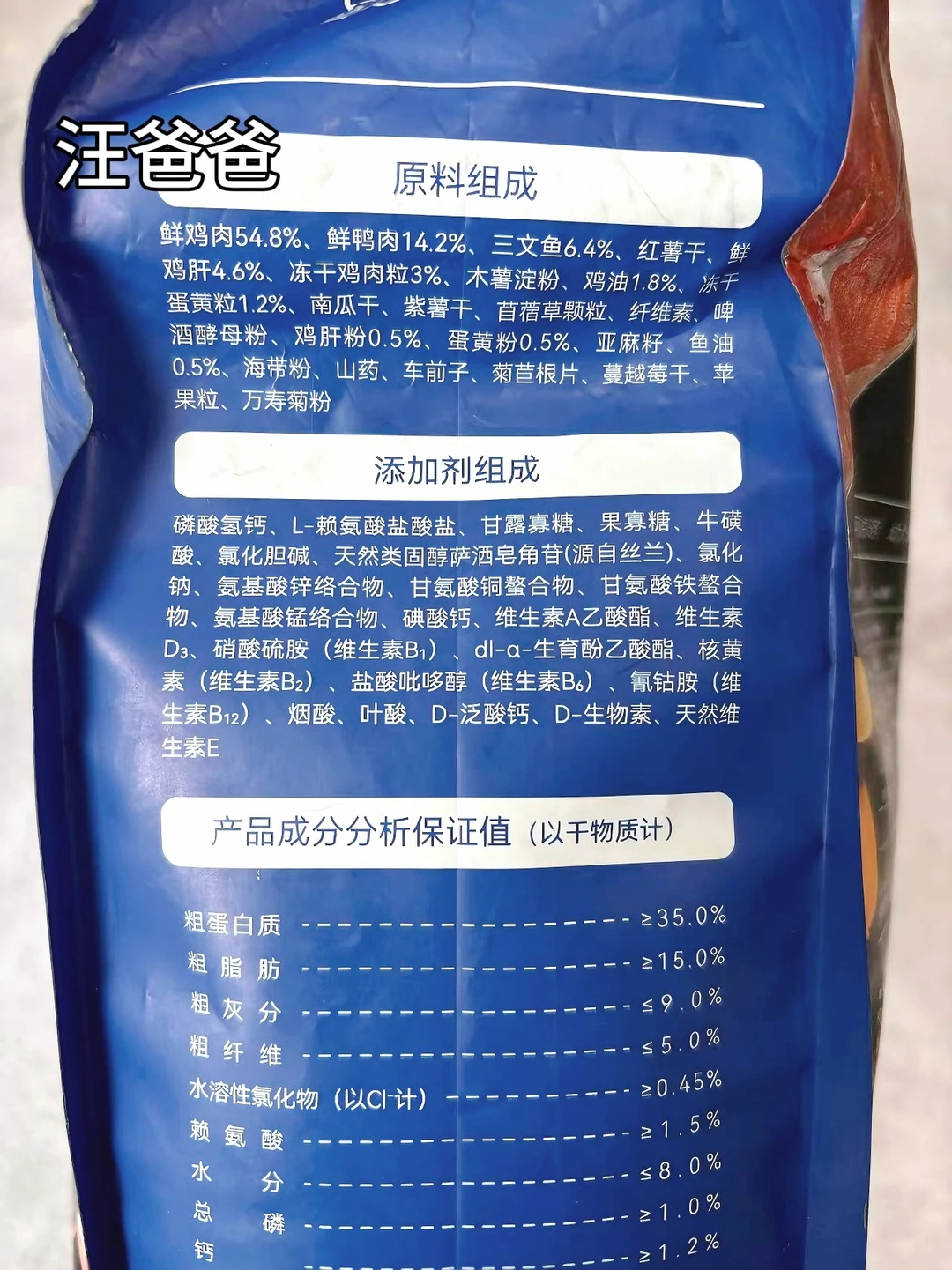 这两款平价狗粮的鲜肉含量都挺高的,诚实一口是鸭肉梨口味,添加了比较多清淡的鲜肉果蔬,看着营养挺均衡的。汪爸爸这款就是鲜肉狗粮,配料表看着没什么问题。
