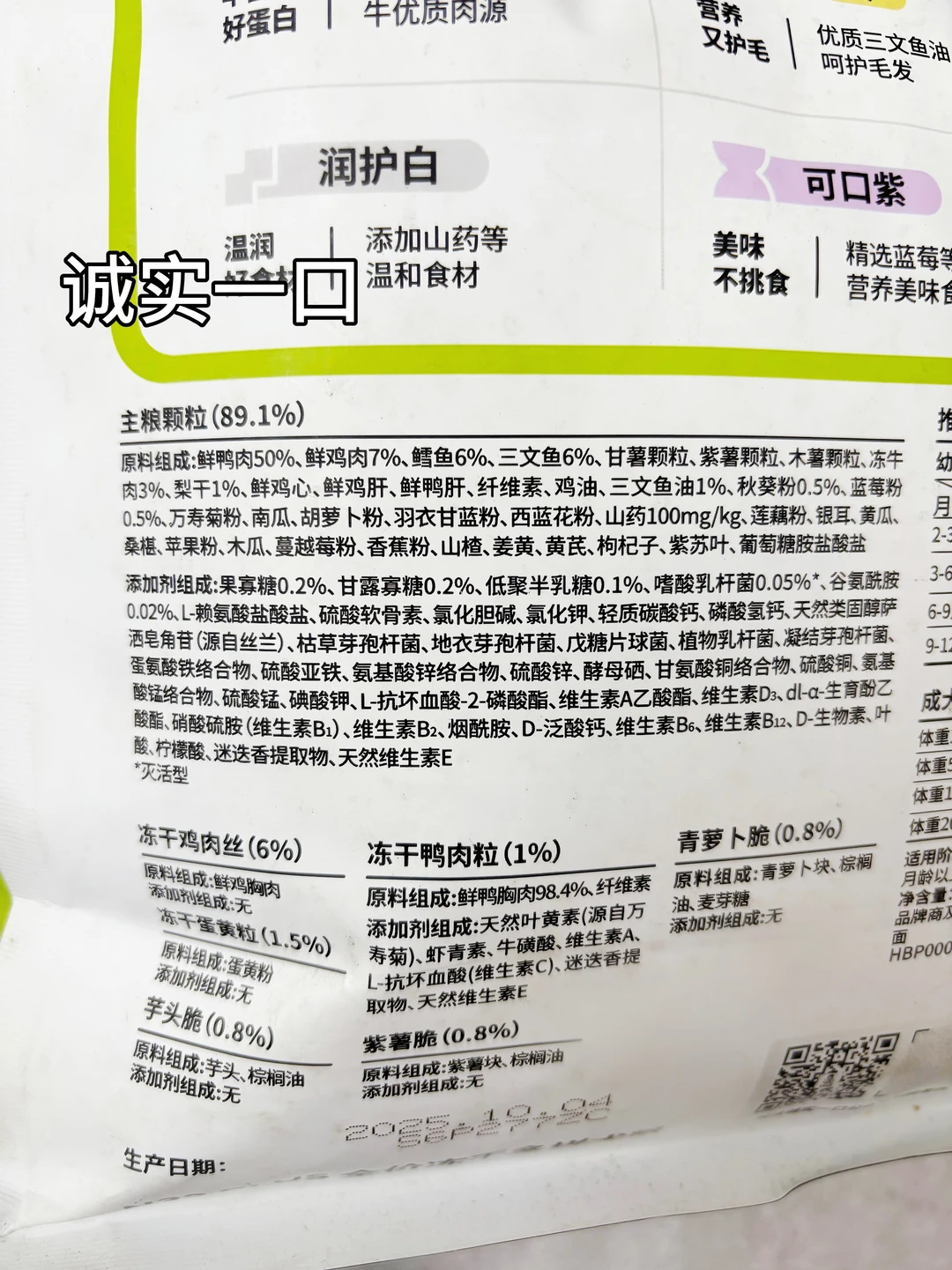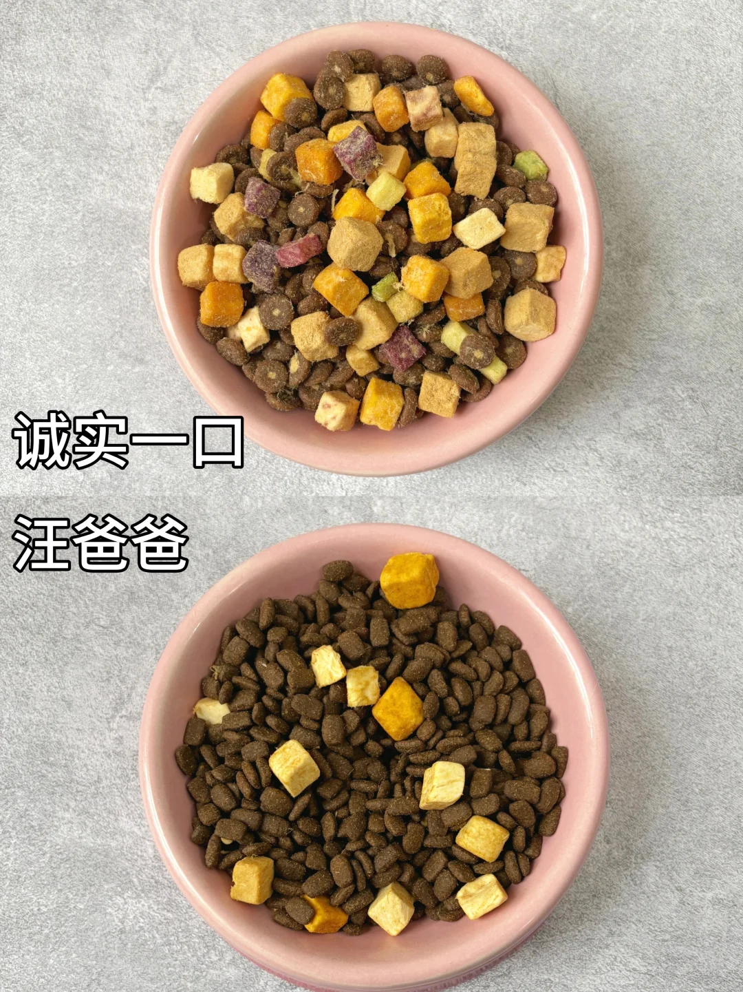 这两款我拆开看了,都是冻干+颗粒的组合,诚实一口的是有五种冻干,鸭肉粒、蛋黄粒、青萝卜脆之类的,颗粒也是夹心颗粒。汪爸爸的是有两种冻干,鸡肉粒和蛋黄粒,颗粒是长方形小颗粒,看着也还可以。