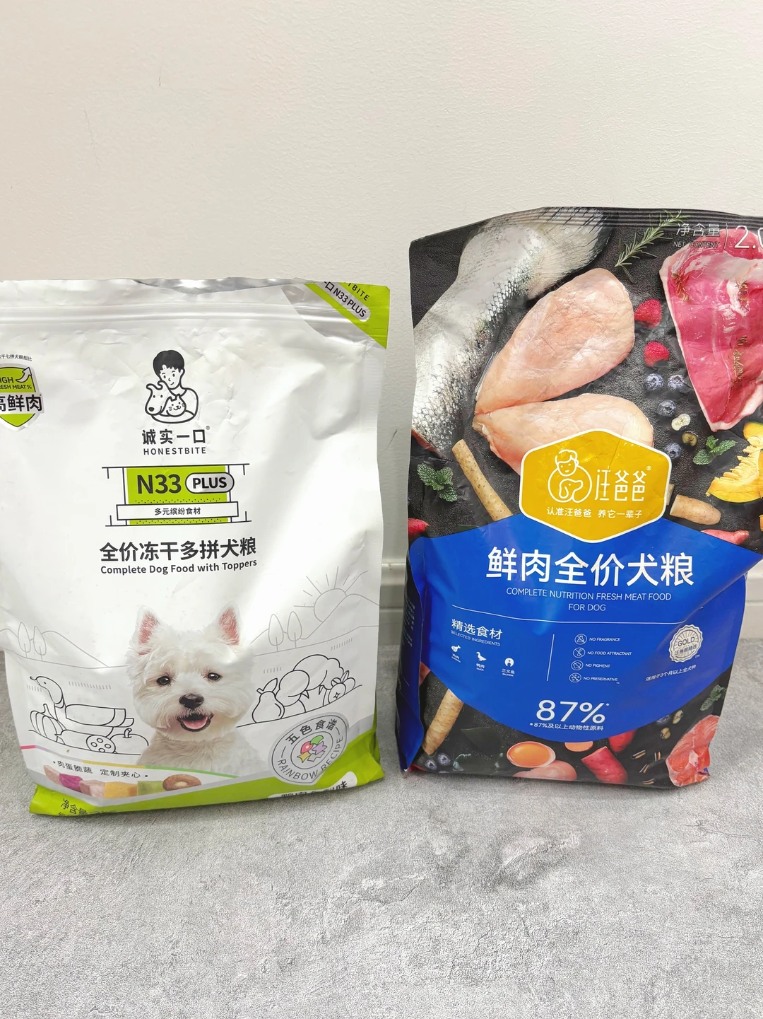 这两款平价狗粮一款是诚实一口n33plus,另一款是汪爸爸狗粮。