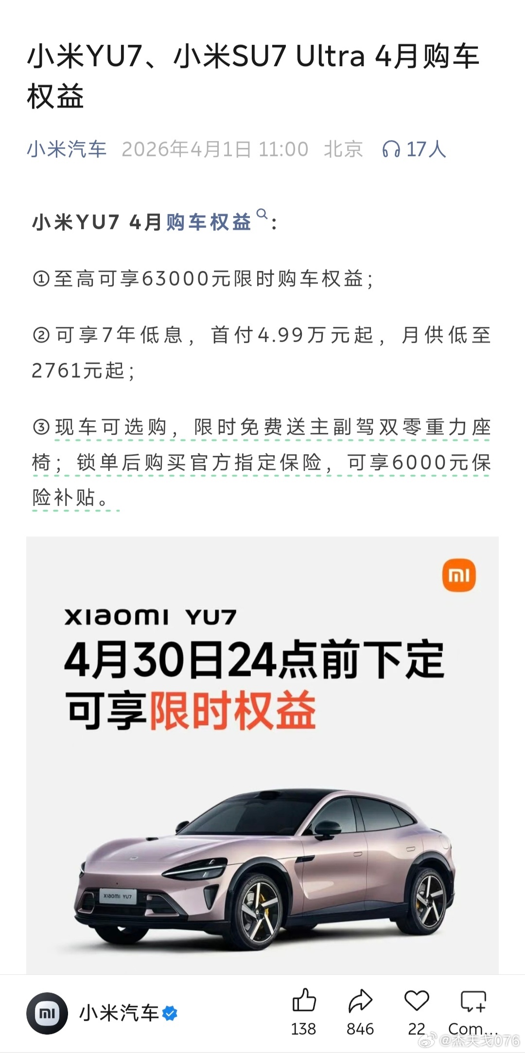 小米汽车 3月份交付超过20000台,其中7000台SU7,YU7还有超过13000的销量,这个时候还有这个销量,真不容易。4月份的促销政策也来了。不知道另外一边的特斯拉怎么样