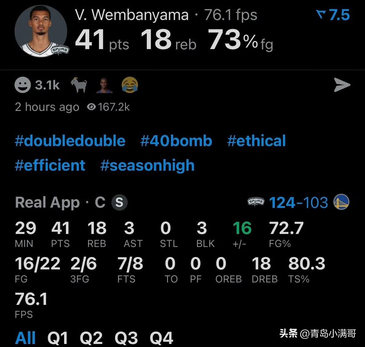 今日最佳应该给到马刺队的文班亚马,全场出战29分钟,41分18篮板3助攻3盖帽,投篮22中16,三分6中2,三节打卡,全力冲击本赛季MVP大奖。