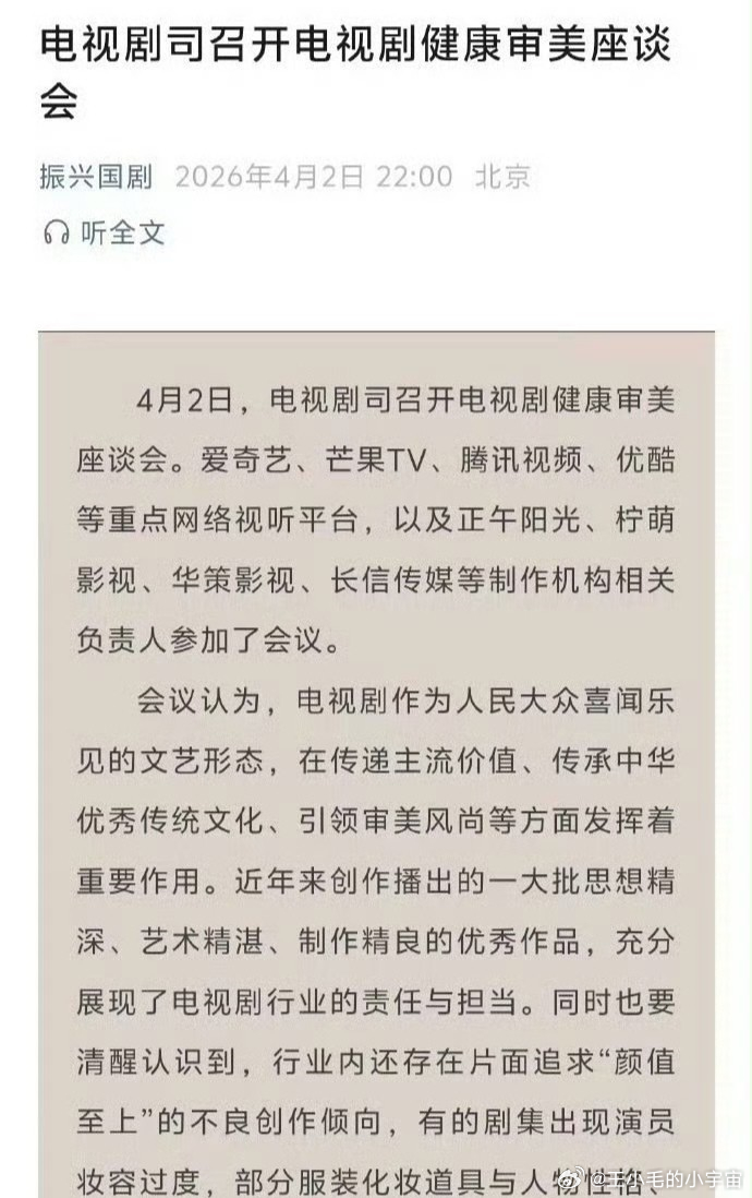 广电出手了!在电视剧健康审美座谈会上重点批评了行业内片面追求"颜值至上"的不良创作倾向。
