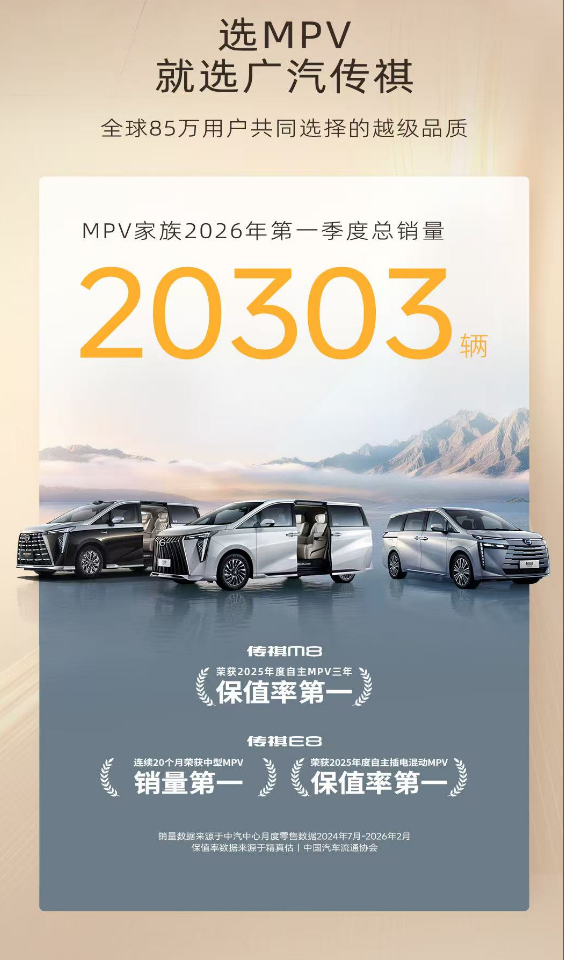 广汽传祺正式公布2026年第一季度销量成绩:全球累计销量9.2万辆,MPV 家族