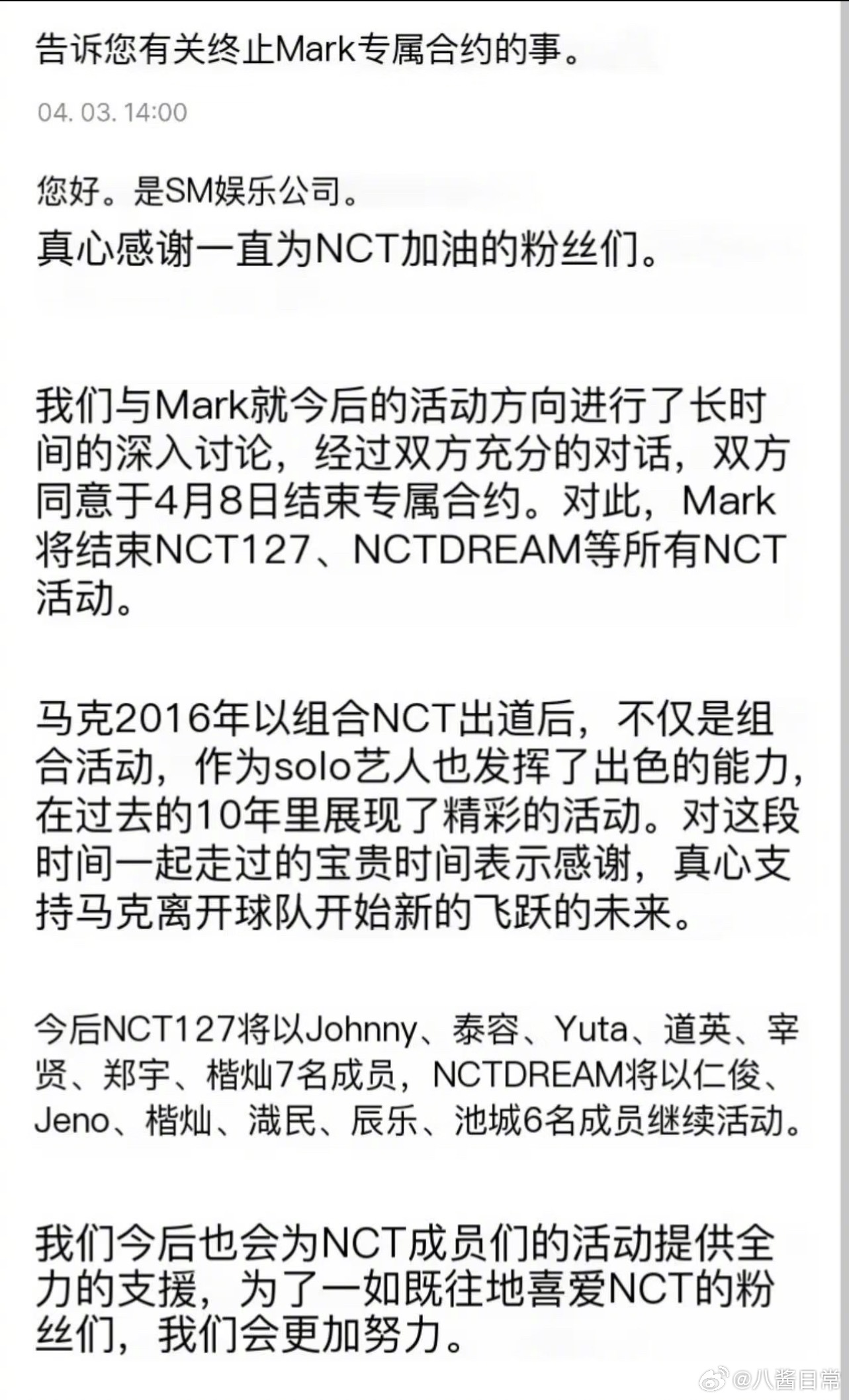 李马克合约到期退出NCT