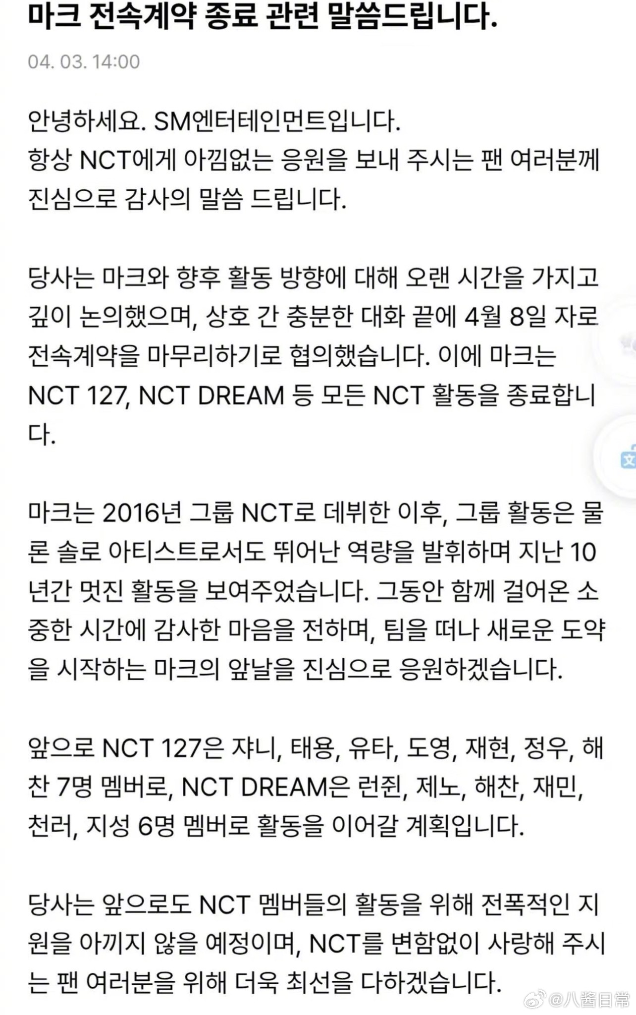 李马克合约到期退出NCT李马克解约退团