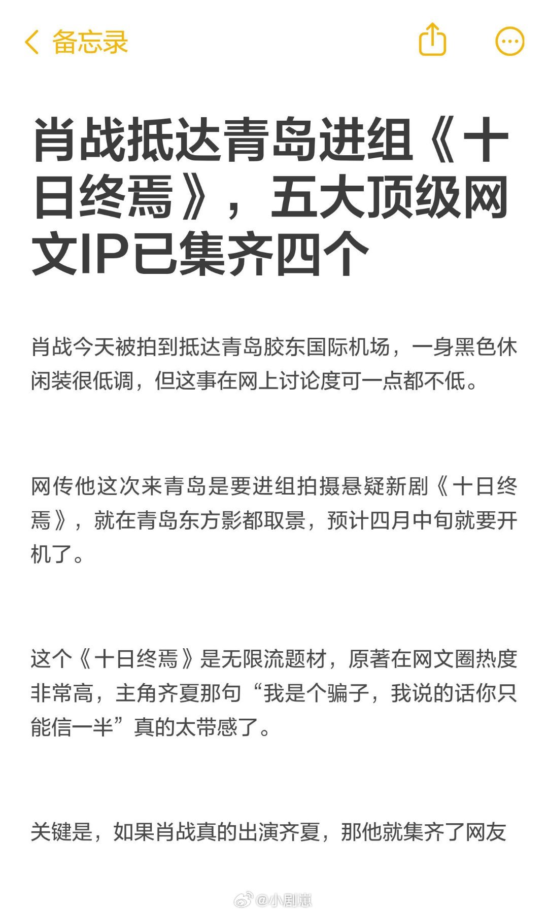 肖战抵达青岛进组《十日终焉》,五大顶级网肖战4月2日抵达青岛,网传将主演悬疑新剧《十日终焉》。如果消息属实,他将集齐网友票选的五大顶级网文IP中的四部,从《陈情令》到《藏海传》,每一部都是现象级爆款。