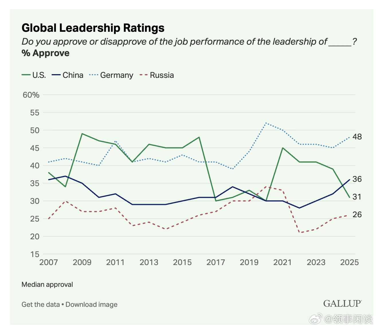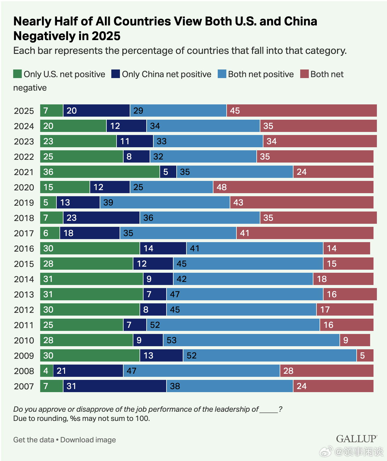 (盖洛普)尽管两国均未获得广泛支持,但2025年中国的全球支持率已超越美国:支持中国领导层的比例中位数为36%,而美国仅为31%。中国领先美国5个百分点,这是盖洛普近20年来记录到的中国支持率优势最大的一次。