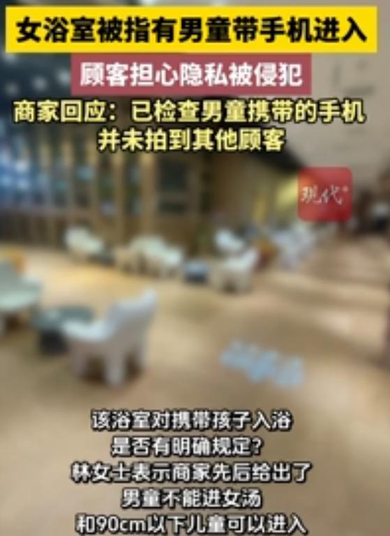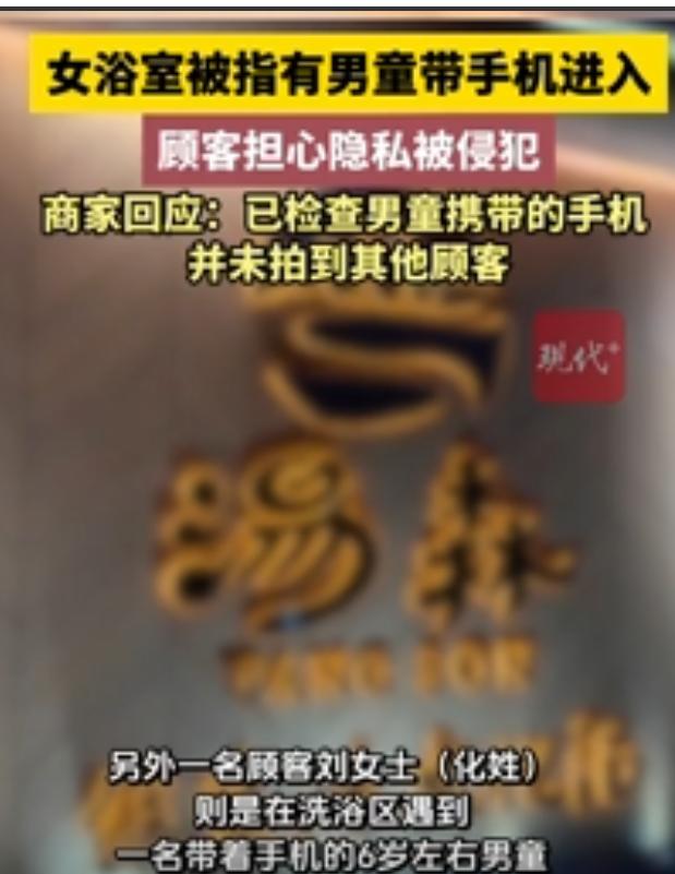 仔细一看,是个6岁左右的男童,手里紧紧攥着手机,时不时举起又放下,动作随意,完全没意识到身处女性专属浴区。