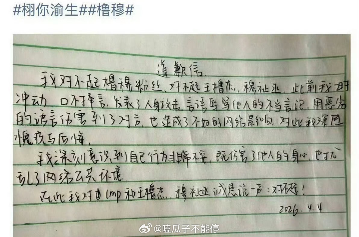 栩你渝生粉丝和橹穆粉丝的道歉信这两家粉丝的道歉信看字体感觉年纪都不是很大的样子