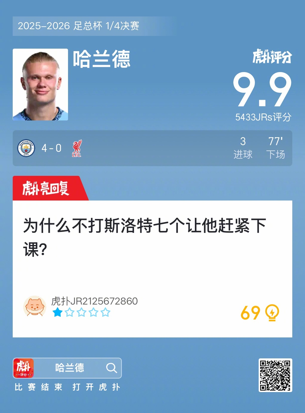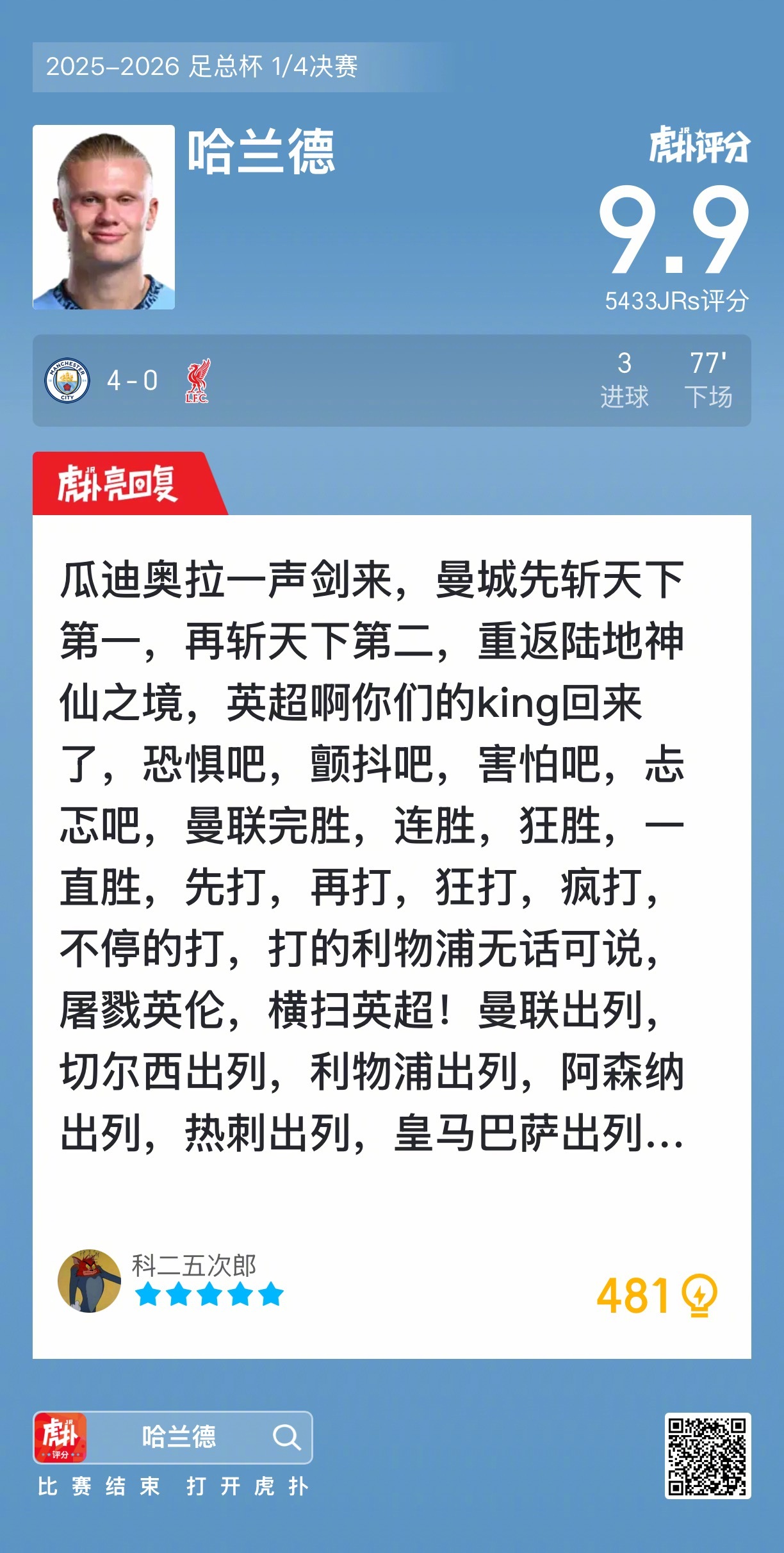 曼城4比0利物浦哈兰德打进三球,赛后收获9.9的虎扑评分!