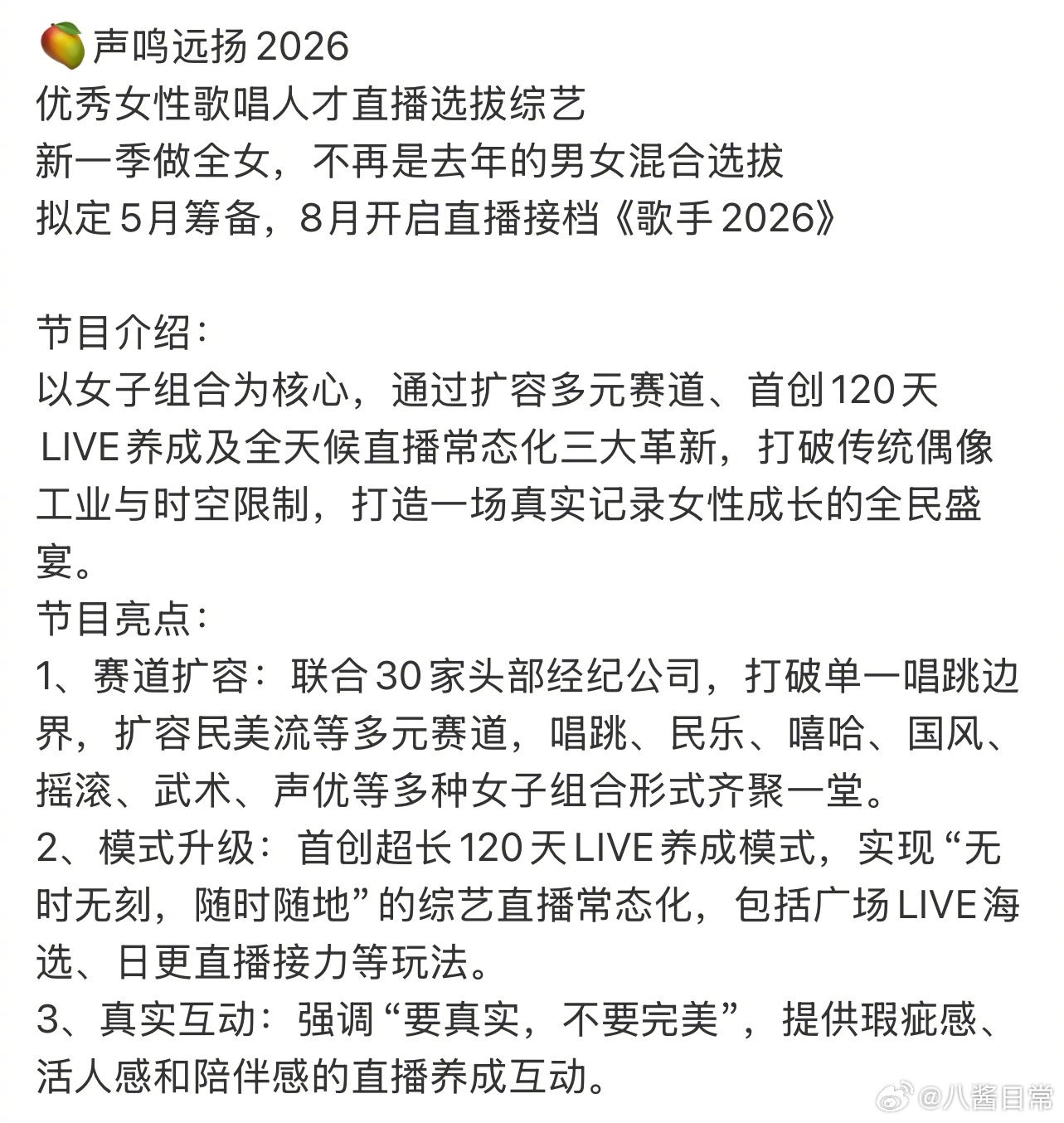 芒果又一档全女综艺《声鸣远扬2026》