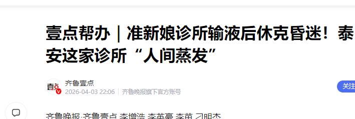 信息来源:《壹点帮办|准新娘诊所输液后休克昏迷!泰安这家诊所“人间蒸发”》,齐鲁壹点,2026年4月3日。